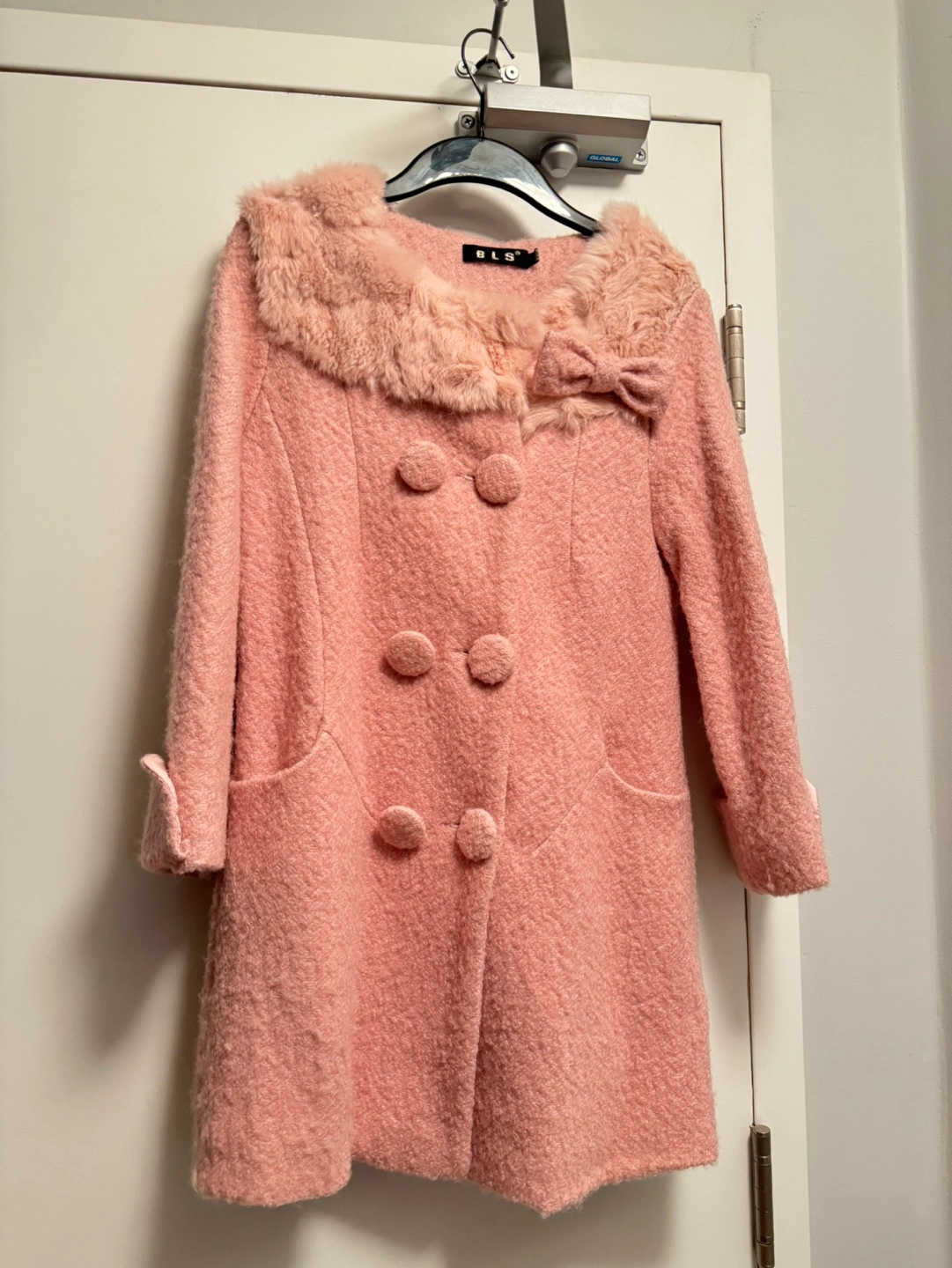 Asian sizing - tag says size L, would fit XS-M depending on how much you’re layering underneath. Bow is removable (it has a pin). Has pockets and is lined! It’s not real wool – just a woven tweed/wool-like material.