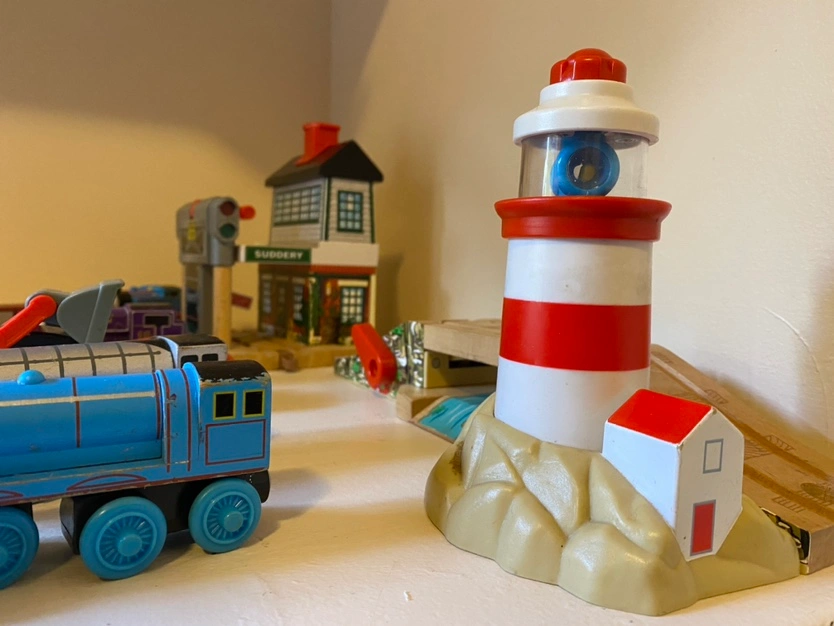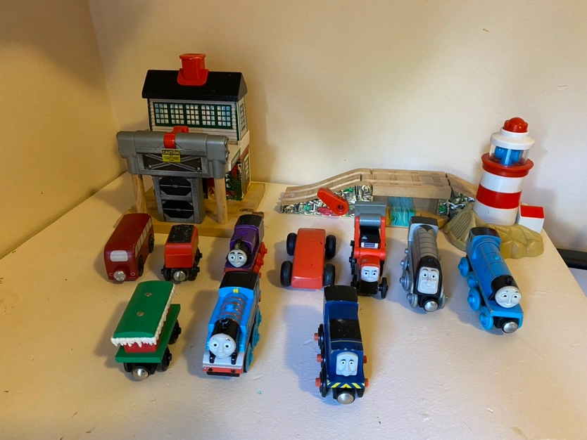 Heavy duty metal train set including Thomas, Gordon, a red truck, a purple train, a green car, a red fire engine, a grey train, a blue train, a bridge, a lighthouse, and a train station.