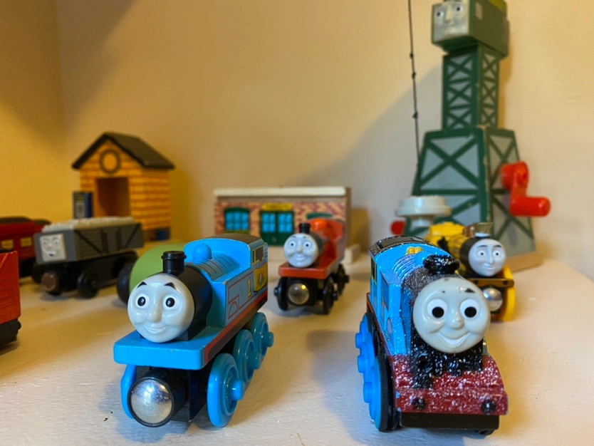Wooden Railway train set, includes multiple engines and track pieces. Cranky the Crane and a station building are also included. -some cars and trains mixed wooden and plastic -Meet Toronto downtown or North York areas