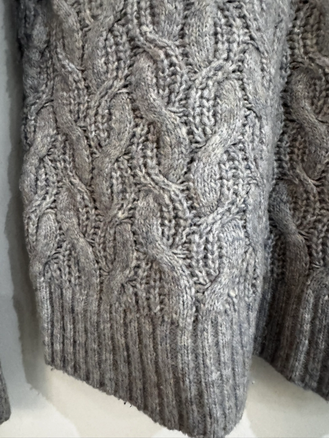 Grey cable knit sweater. Size small. Long sleeves. Round neckline.