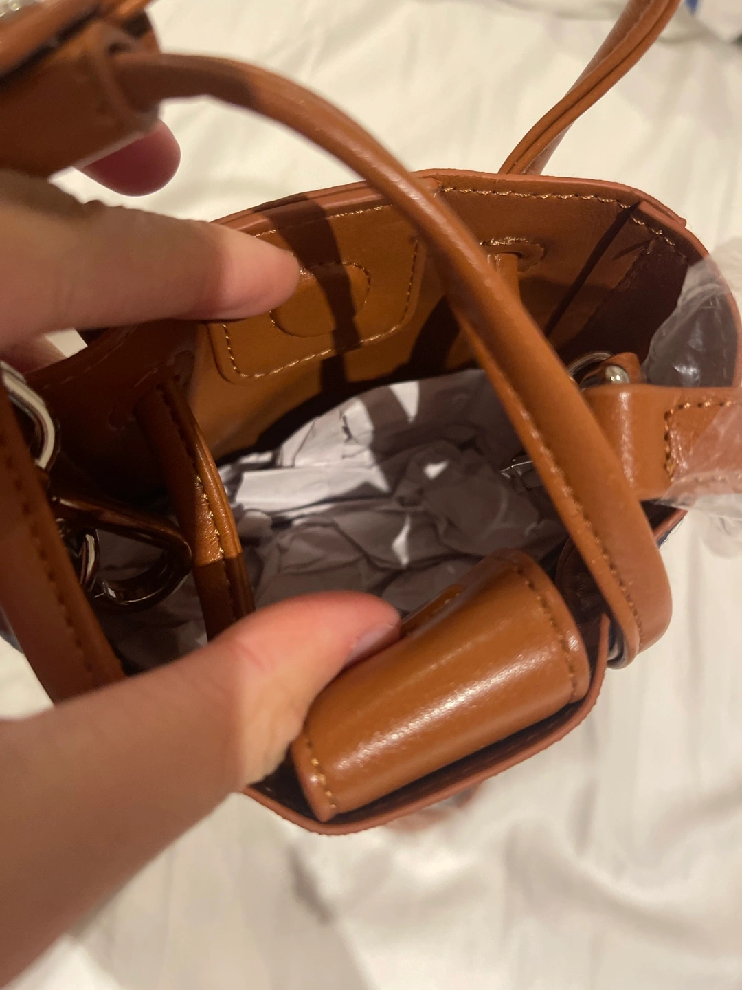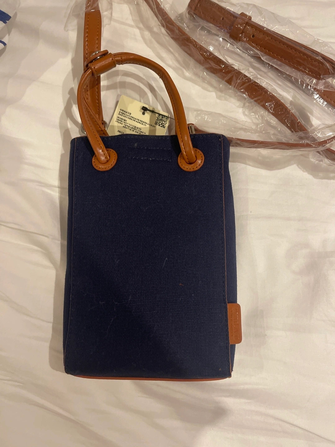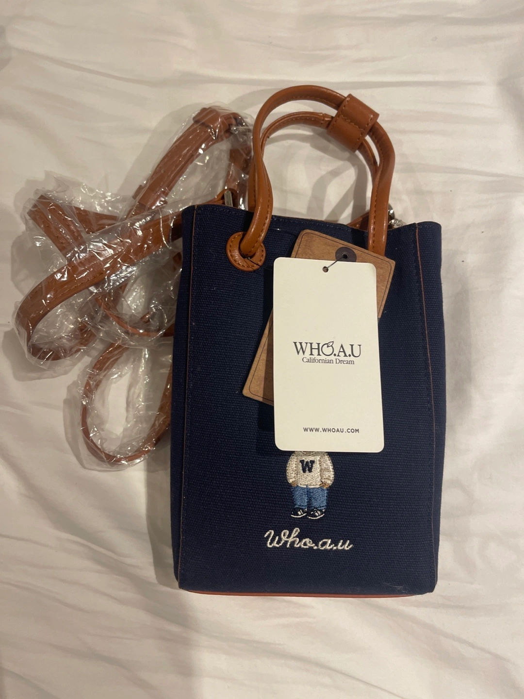 Small navy blue crossbody bag with a brown strap and handle. Has a small embroidered bear on the front. Bought for ₩49900 in Korea, around $50 CAD without tax. BRAND NEW