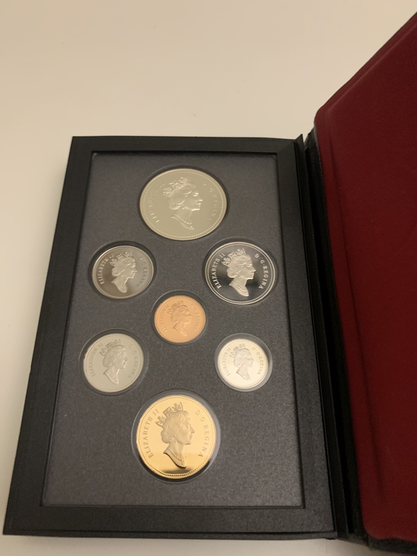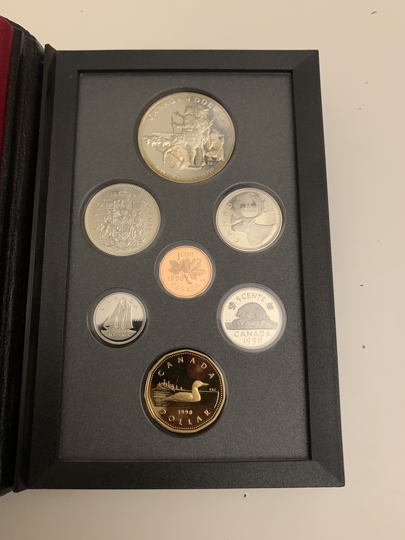 Contains a proof set of 1990 Canadian proof coins, including a silver Kelsey Dollar.