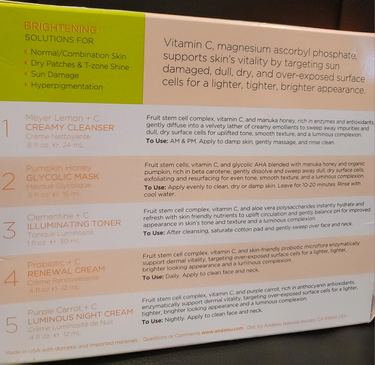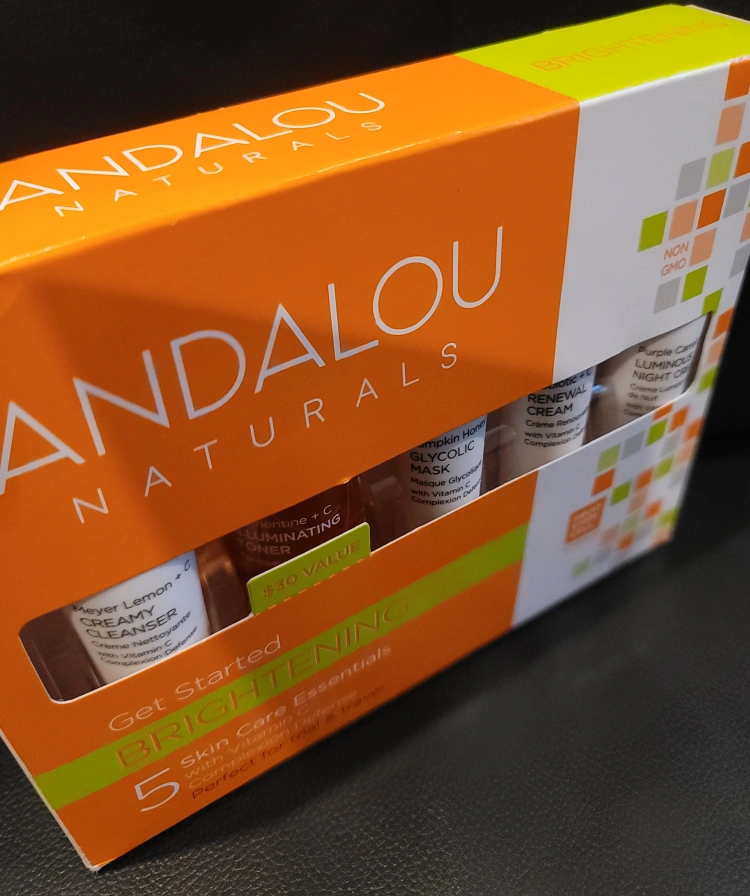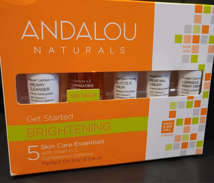 Get started with Andalou Naturals brightening skin care essentials. Includes five trial-sized products: cleanser, toner, mask, cream and night cream for a brighter and even complexion.