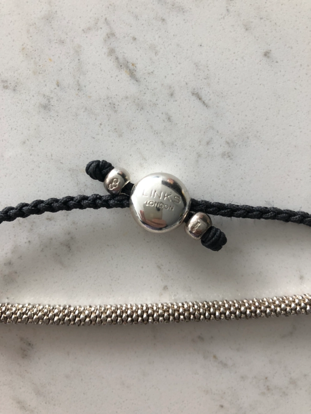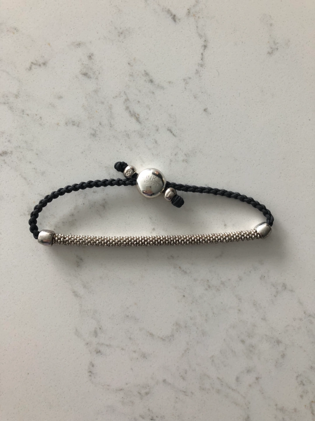 Links of London has taken a friendship bracelet and elevated it into this elegant piece of wrist candy from the Effervescence collection! Made of sterling-silver beads polished to the quality of fizzy champagne bubbles, it’s strung on a stretchy thread for a comfortable fit. The beads are connected to an adjustable black woven cord with hallmarked sterling-silver embellishments. In gently-worn, very good condition.