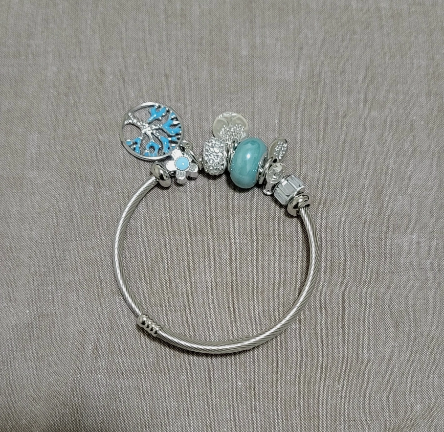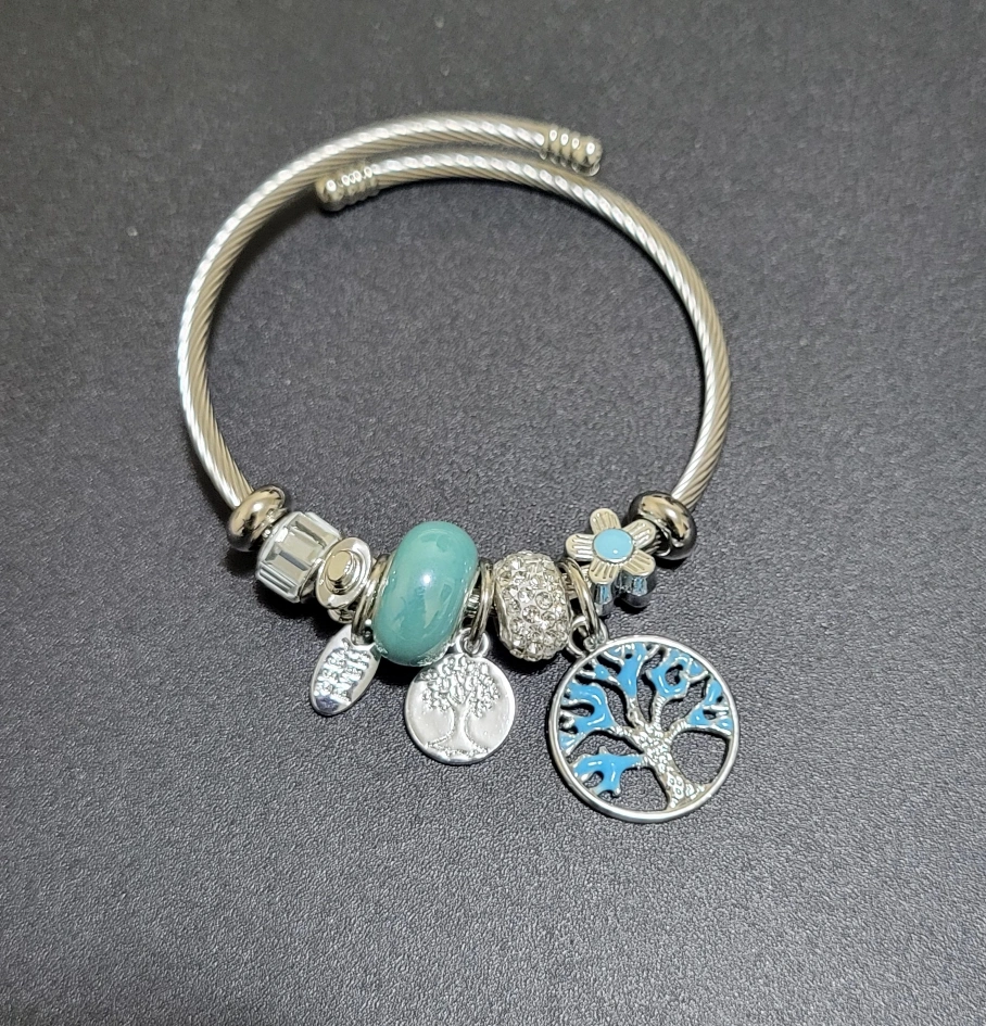 Silver bangle bracelet with charms, including a tree of life charm. Comes with multiple charms, including a turquoise bead and a small flower.