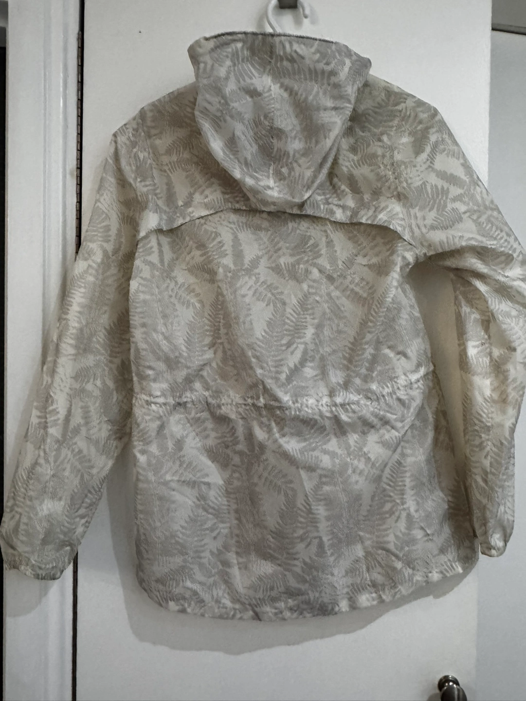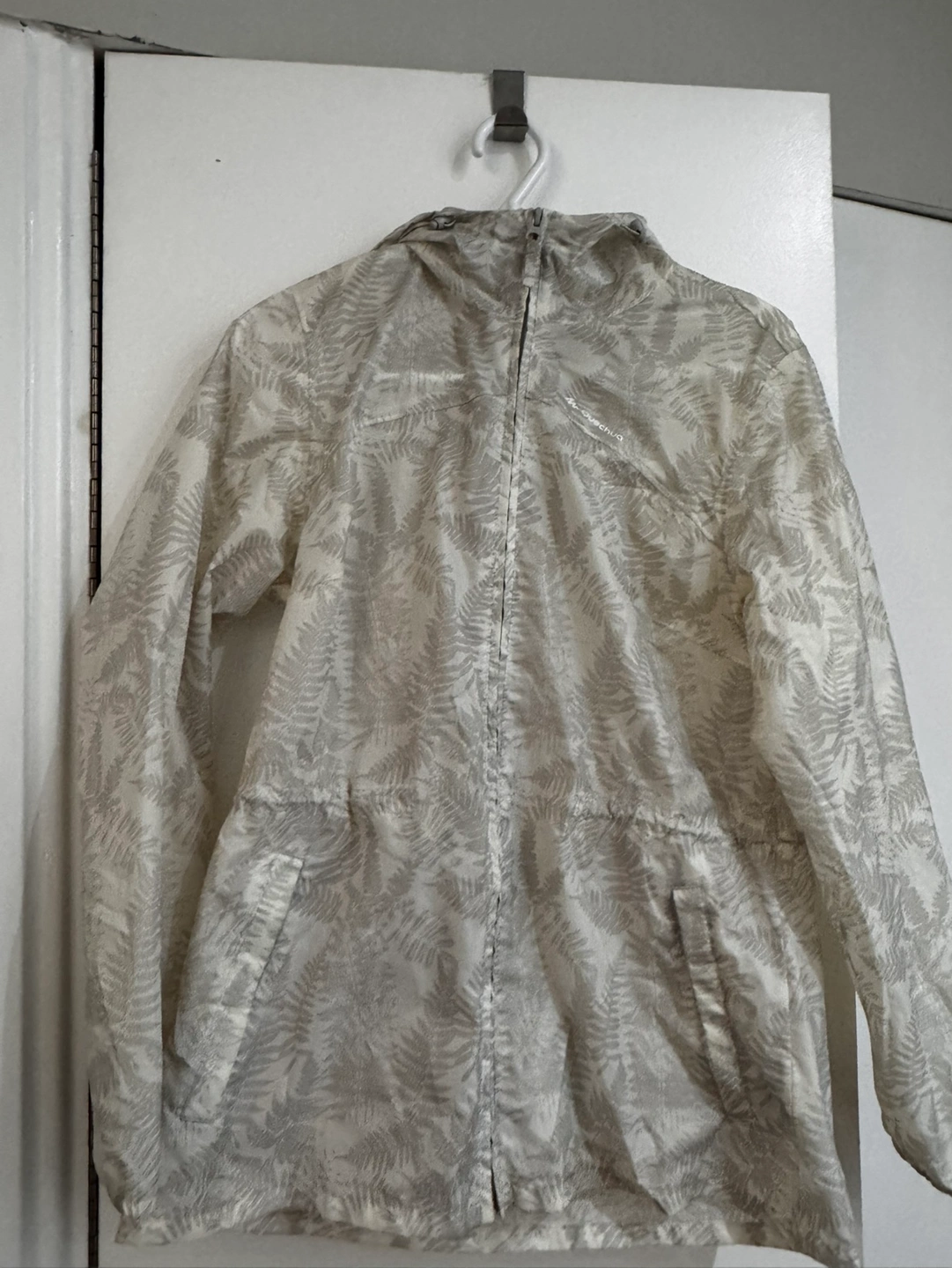 Lightweight rain jacket with a floral print. Has a hood and pockets. Size Medium.
