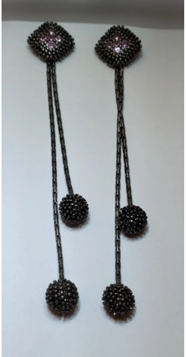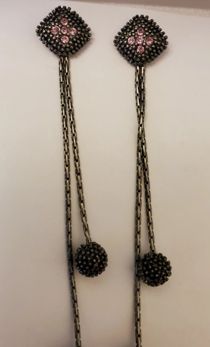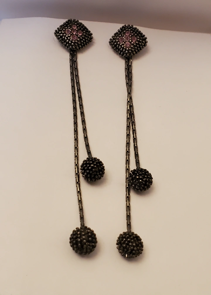 Vtg. Thai Silver tone dangle earrings with amethyst stones. Square top with three round accents. 4inch.