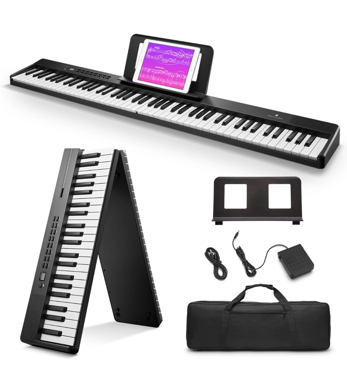 88-key digital piano with built-in speakers, sustain pedal, music stand, and carrying bag. Folds in half for easy transport.