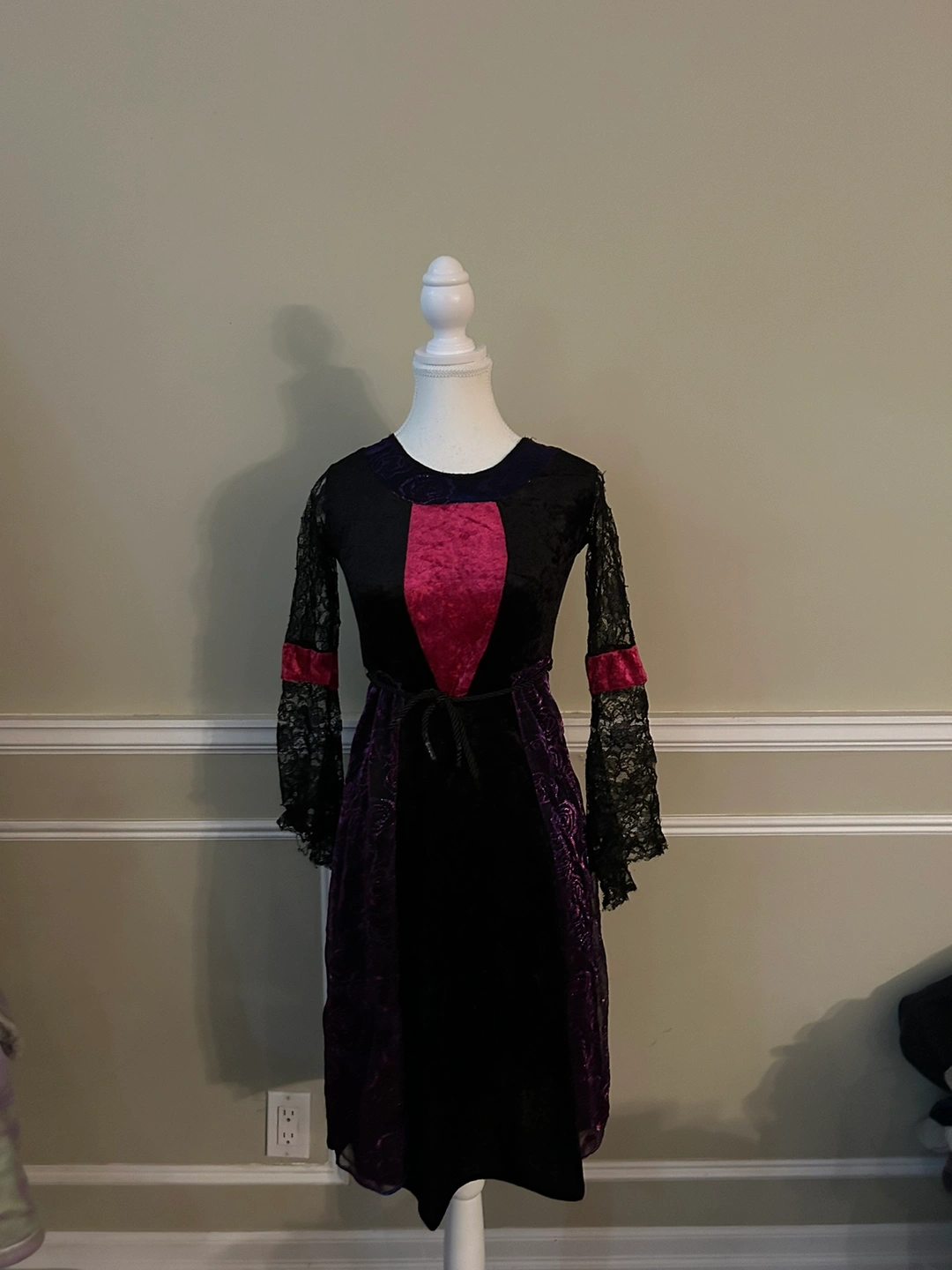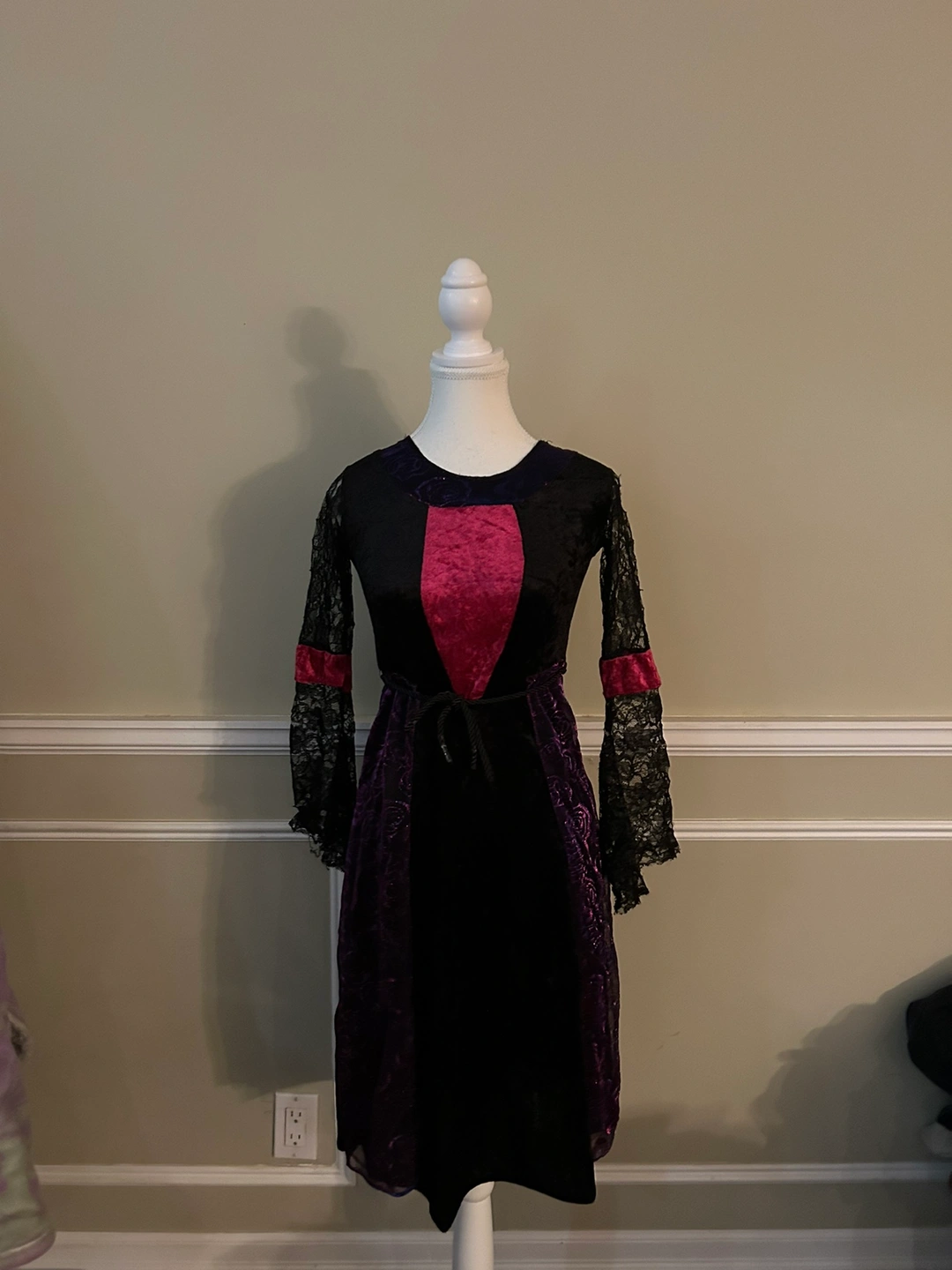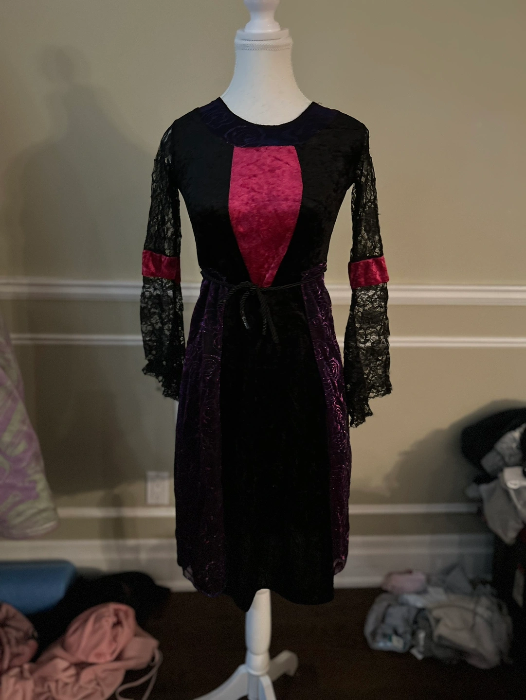 Black lace dress with purple velvet detailing. The sleeves have pink velvet trim. The dress has a tie belt.