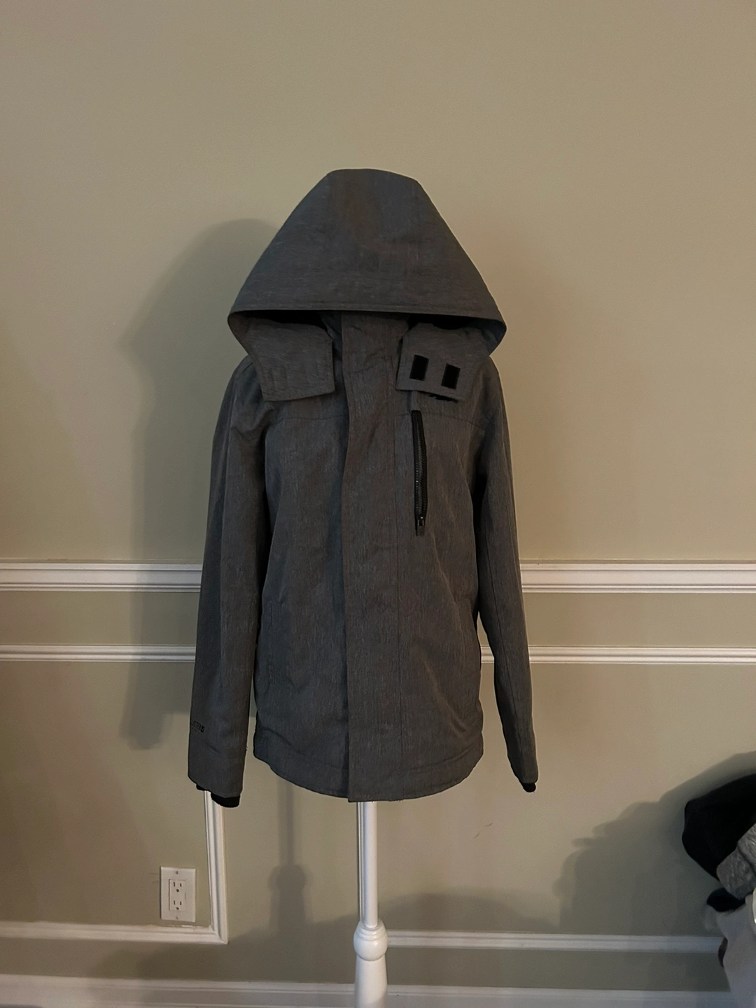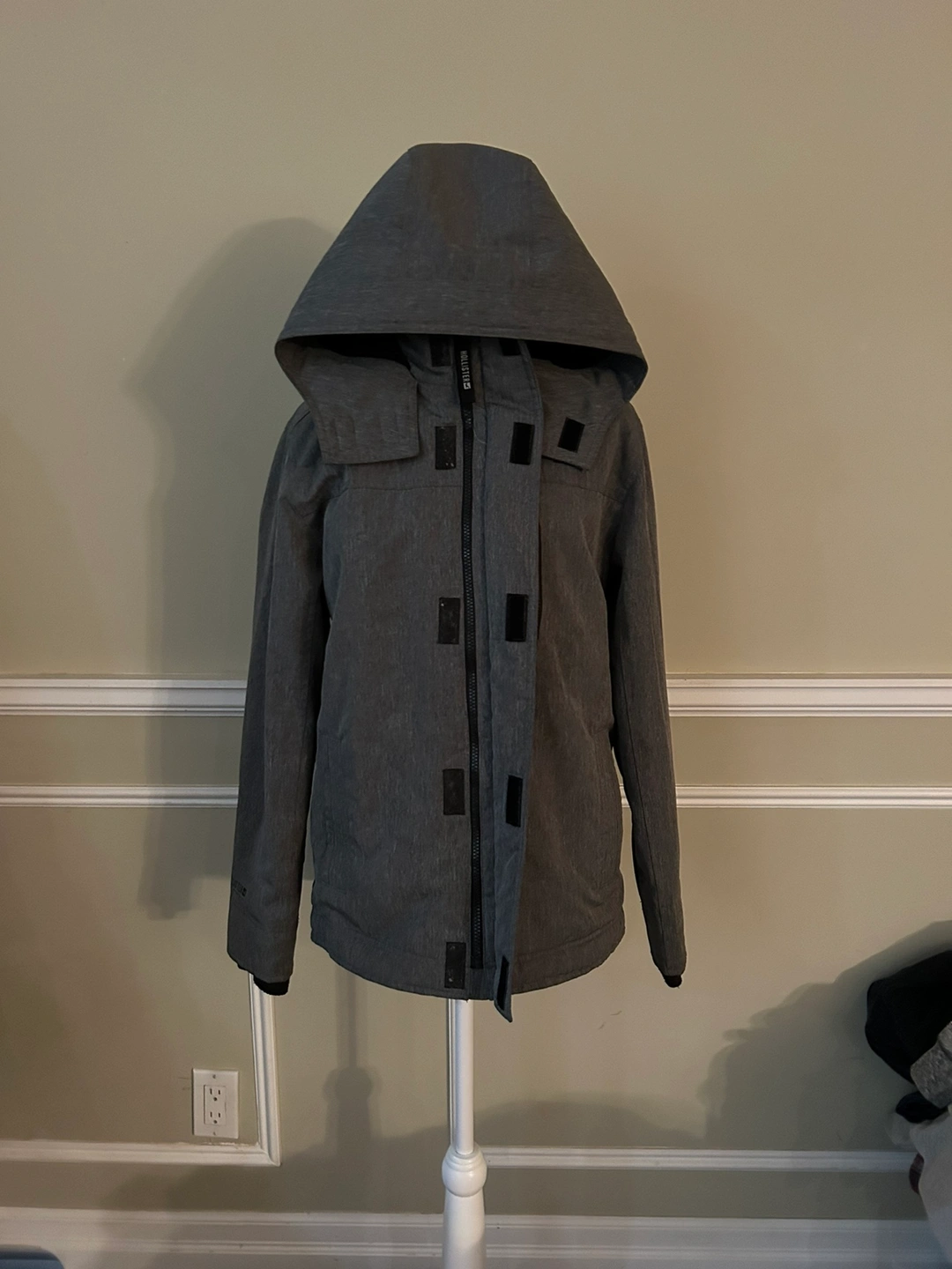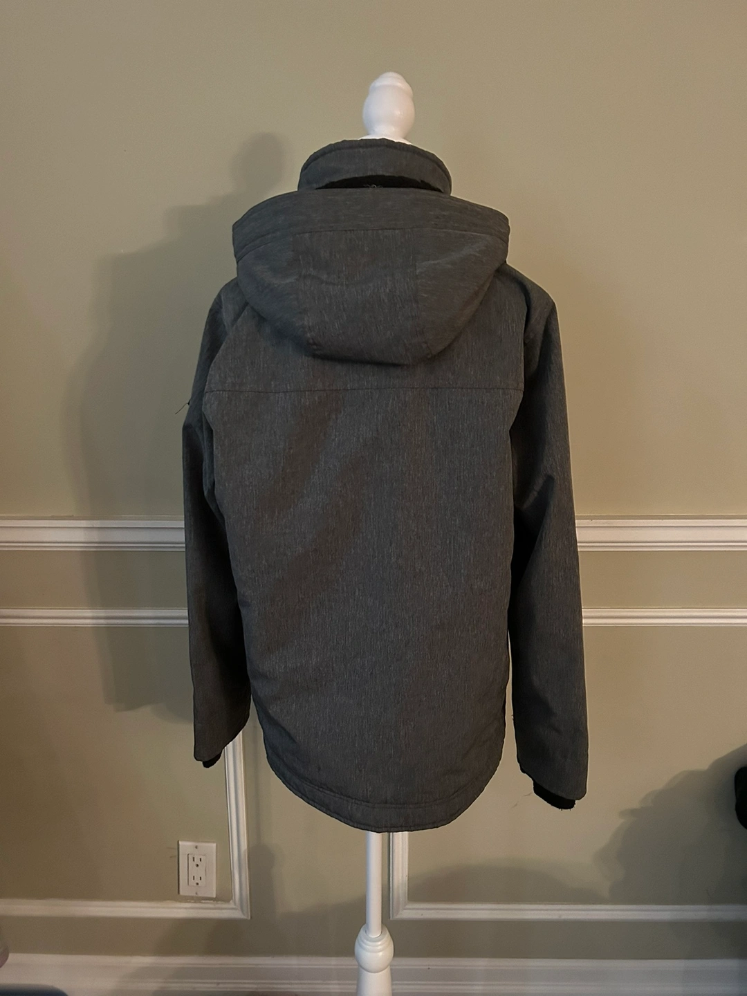 Men's grey winter jacket with a hood. Has zipper and button closure. Fleece lined.