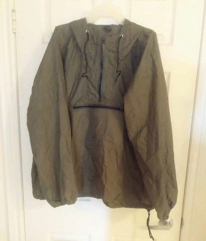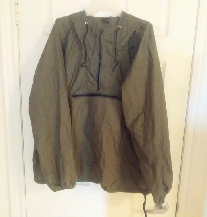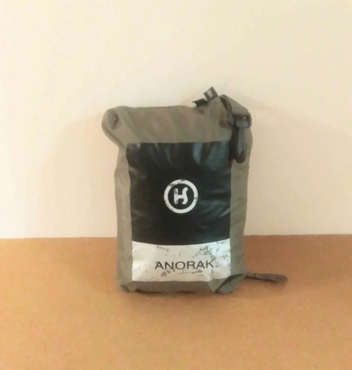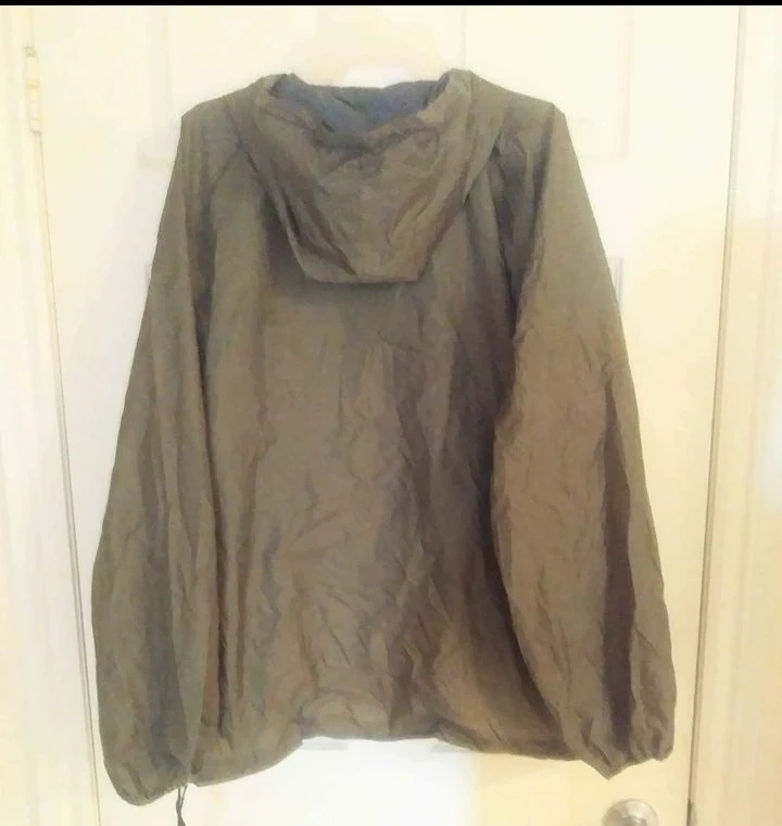 A lightly used, waterproof, unisex anorak/jacket, with a hood, that folds into a small bag. The anorak is thin and lightweight. It has a zippered front with a pouch pocket, 2 side pockets, and long sleeves with elasticized cuffs. The bag has a belt clip for easy portability.