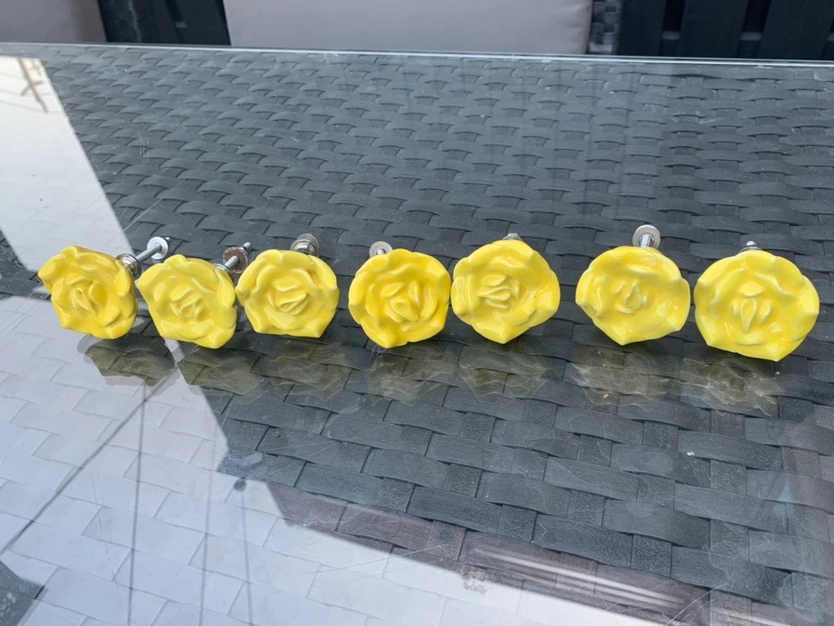 Set of 7 yellow rose cabinet knobs. Each knob has a silver screw. Good condition.
