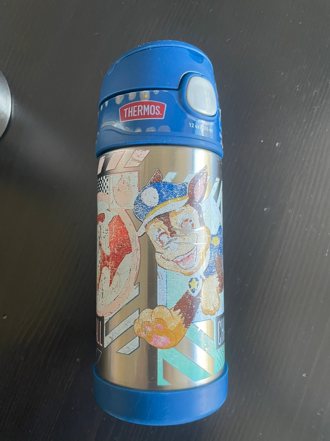 66612 oz stainless steel water bottle. Features a blue lid and a Paw Patrol design.