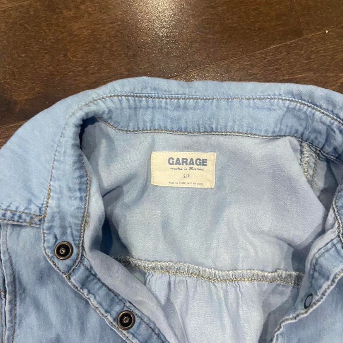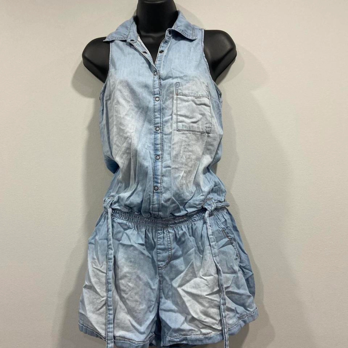 Light blue denim jumpsuit with button front and pockets. Elastic waistband. Some wear. Flaw pictured in last photo. Denim looking chambray mini shorts romper. Removable belt included. Size small.