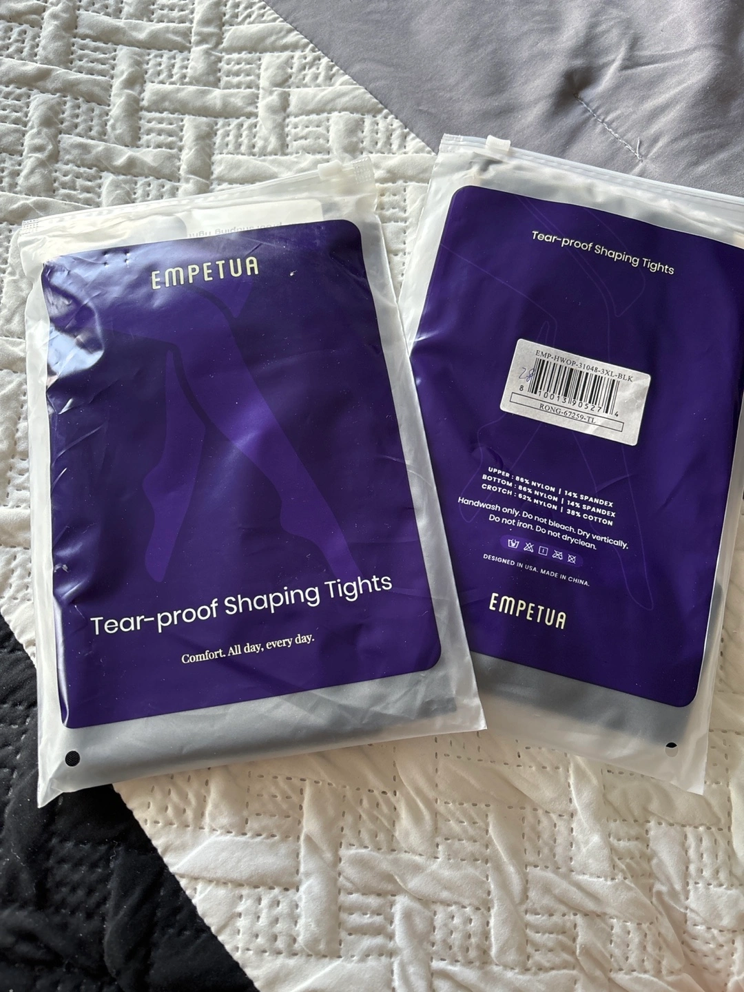 Black, 3XL size, tear-proof shaping tights. Hand wash only, do not bleach, do not iron, do not dry clean. Designed in USA, made in China.