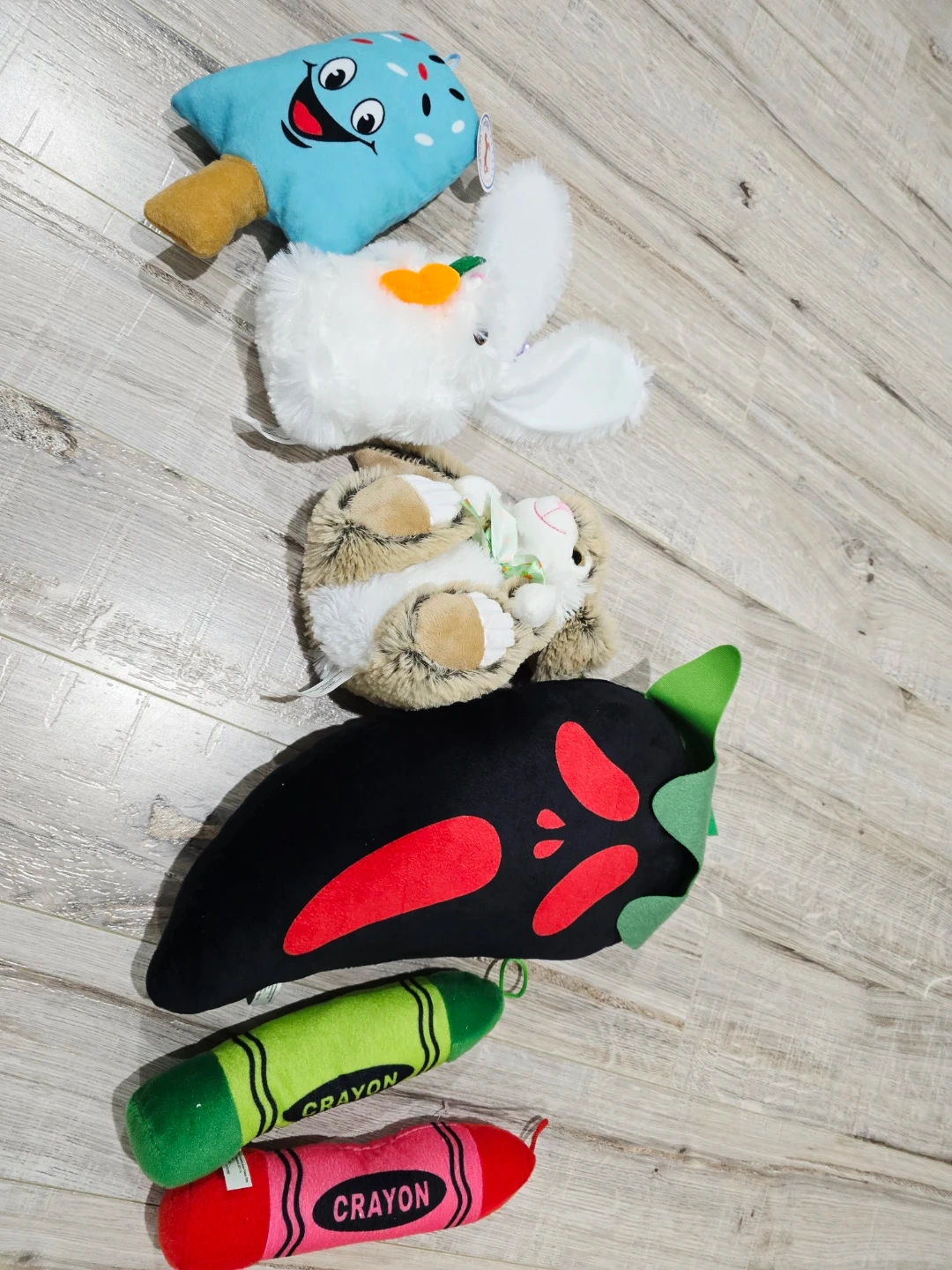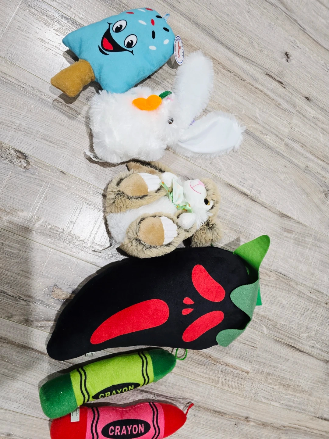 This lot includes a variety of plush toys. There's a blue ice cream pop, a white bunny with a carrot, a brown and white bunny, a black chili pepper, and two crayon toys.