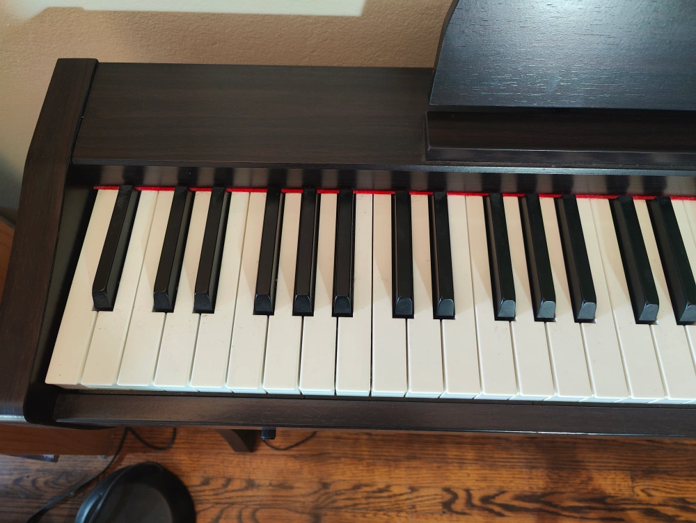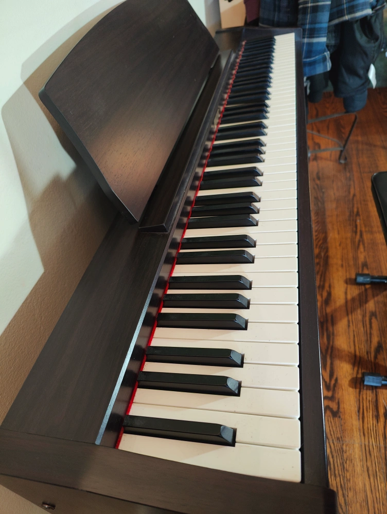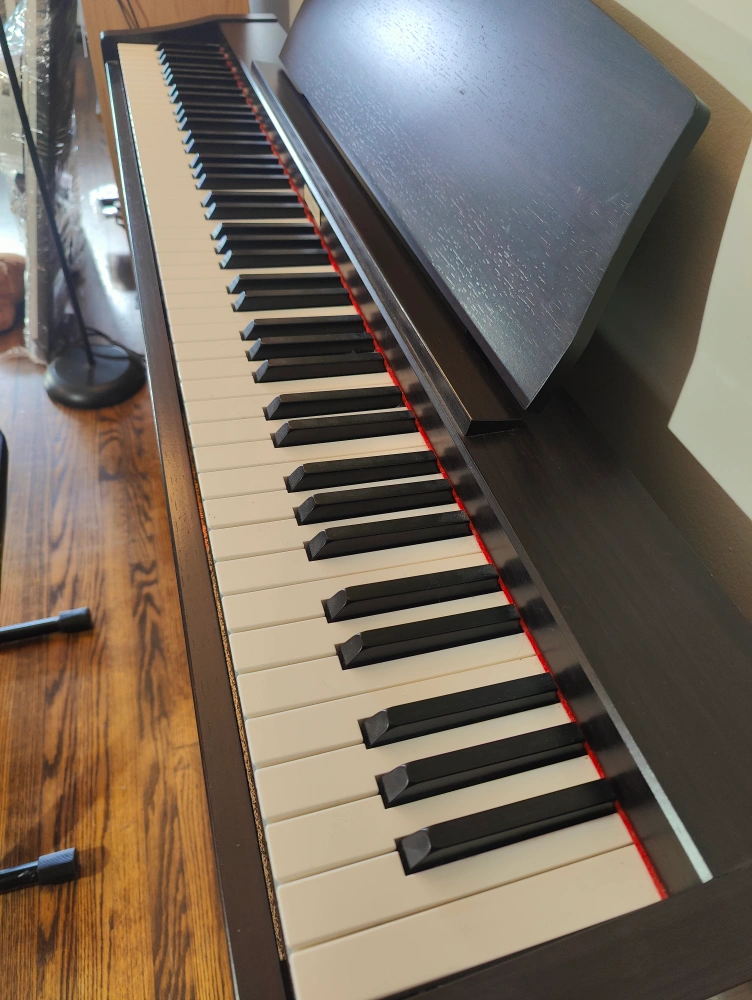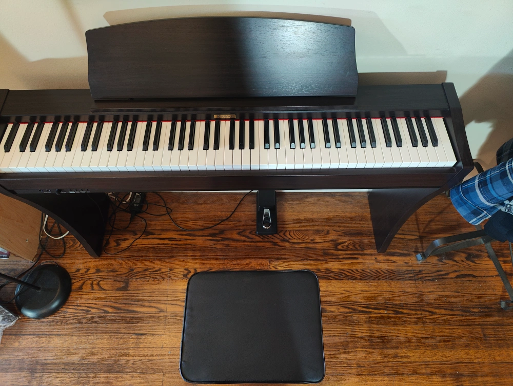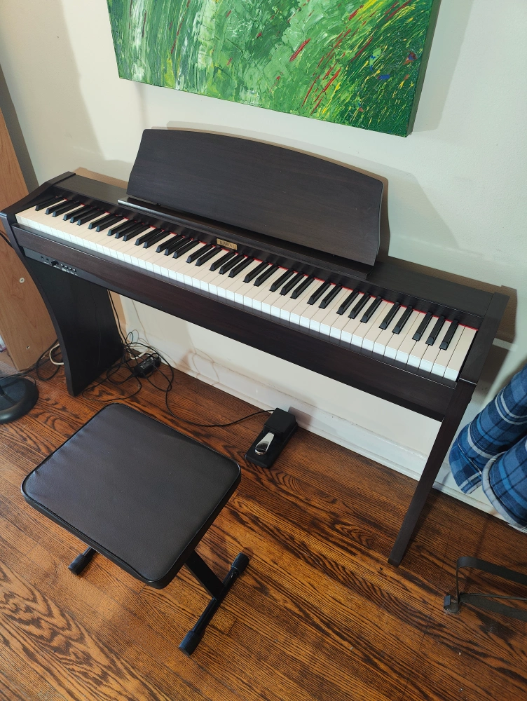 160KAWAI CL-25R, 88 Fully weighted keys digital piano like new condition. It comes with stand, music rest, power adapter, headphones, sustain pedal and stool. With elegant curves and graceful simplicity, the improved KAWAI CL25 represents a timeless classic from award winning designer Tomoyasu Ikegawa. At just 28cm deep, this ultra-compact digital piano occupies a minimal amount of floor space, blending effortlessly into today's modern living environments. From aspiring professionals with a passion for music, to young families wishing to encourage artistic expression within the home, the KAWAI CL25, available in either distinguished natural Rosewood or fashionable Cherry finishes, offers exceptional quality at an attractive price.