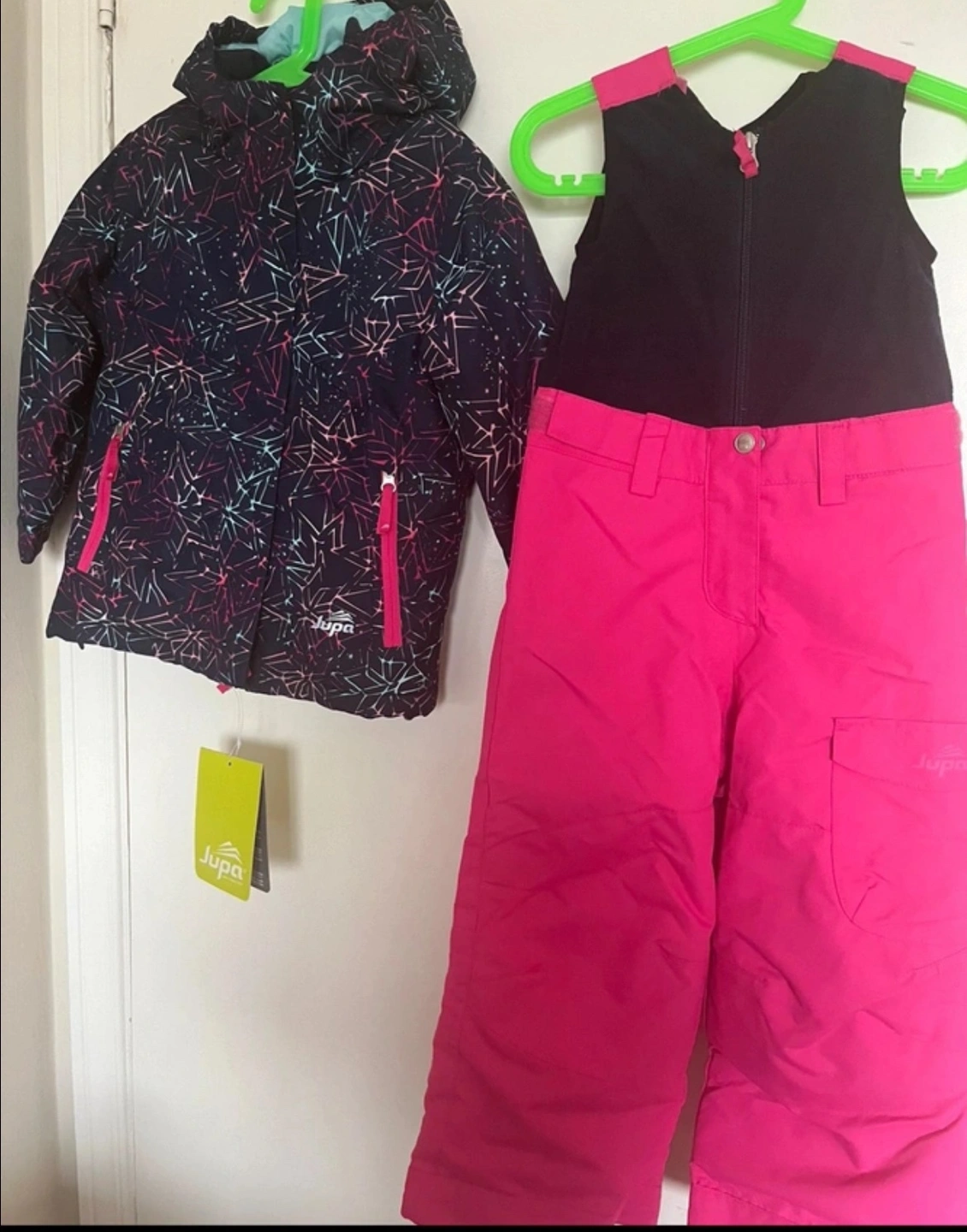 Girls ski jacket and pants set. Jacket has a black background with pink and blue detailing. Pants are pink.I bought them $120