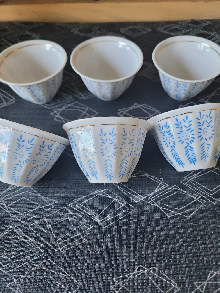 Set of 6 teacups, blue and white pattern, gold trim.