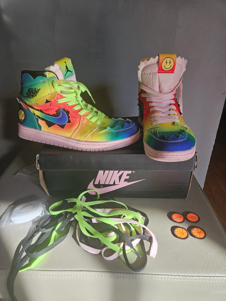 Only worn a few times Rainbow colourway. Comes with original box, multiple laces, and shoe charms.