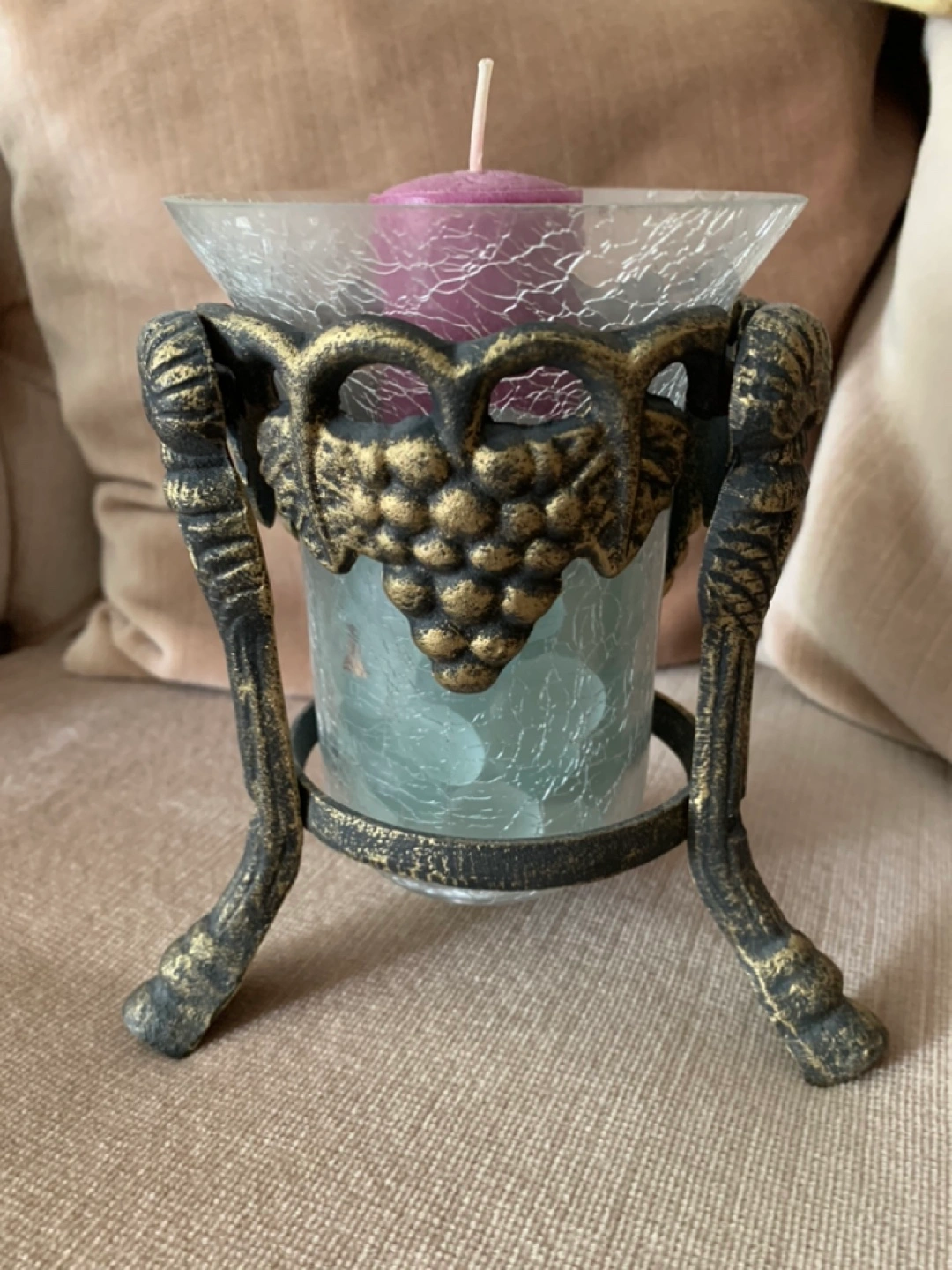 Vintage Metal candle holder with a crackled glass votive. The metal base has a grapevine design. The glass votive has a crackled finish.
