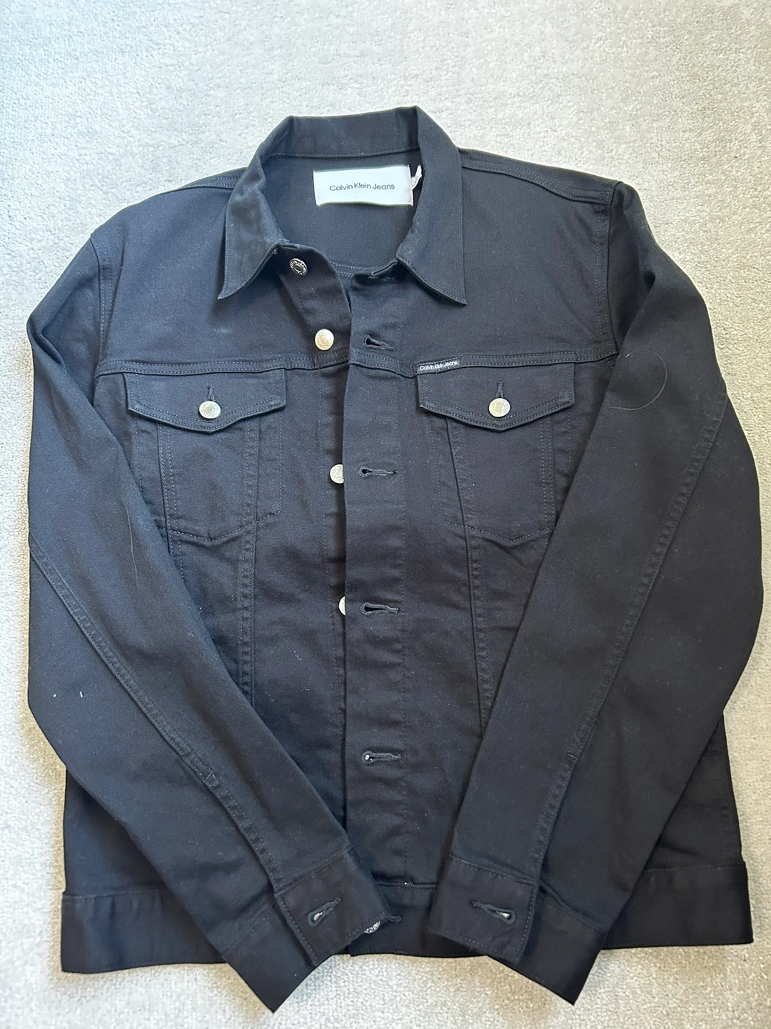 Black denim jacket with button closure. Two chest pockets and two lower pockets.