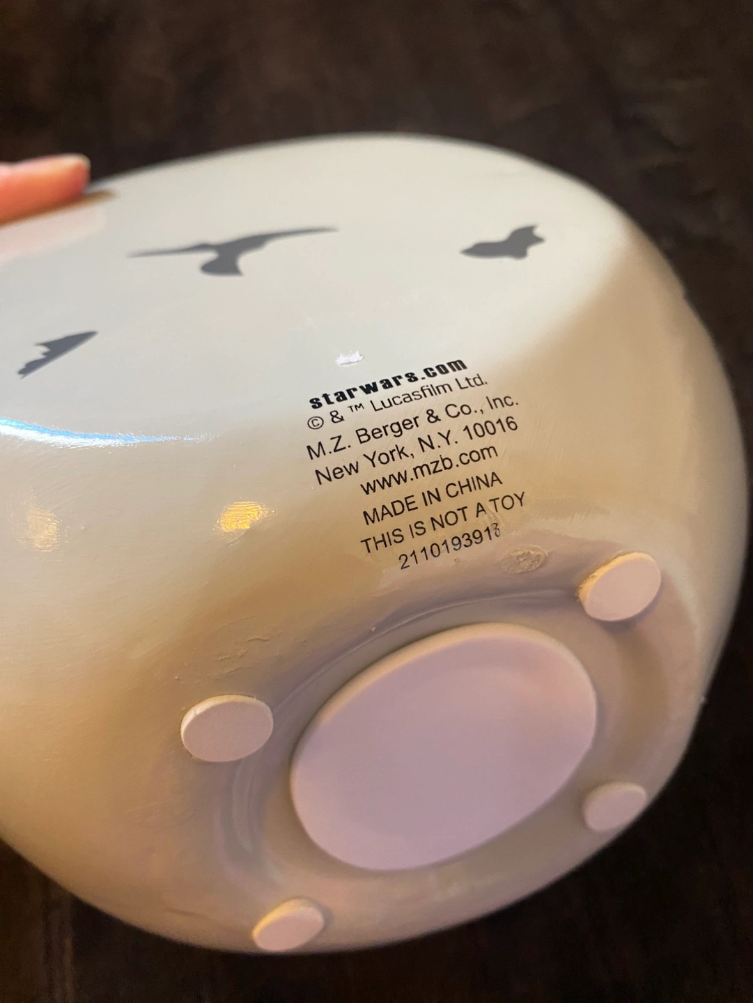 572Ceramic piggy bank featuring The Child from Star Wars: The Mandalorian. Includes a slot for coins on top and a removable rubber stopper at the bottom.