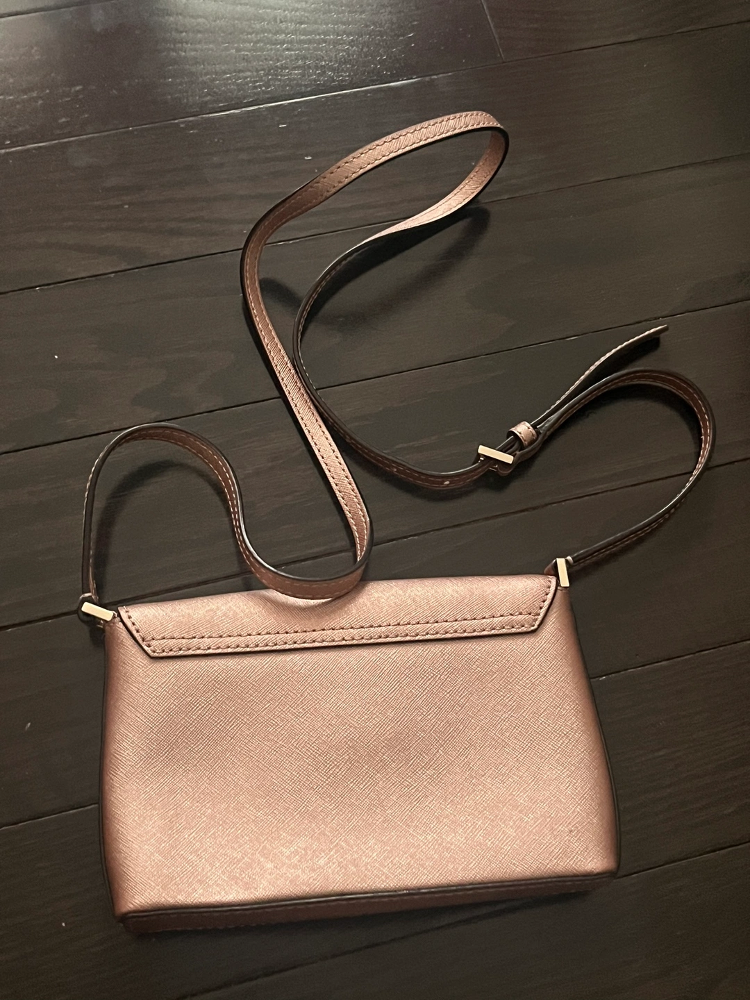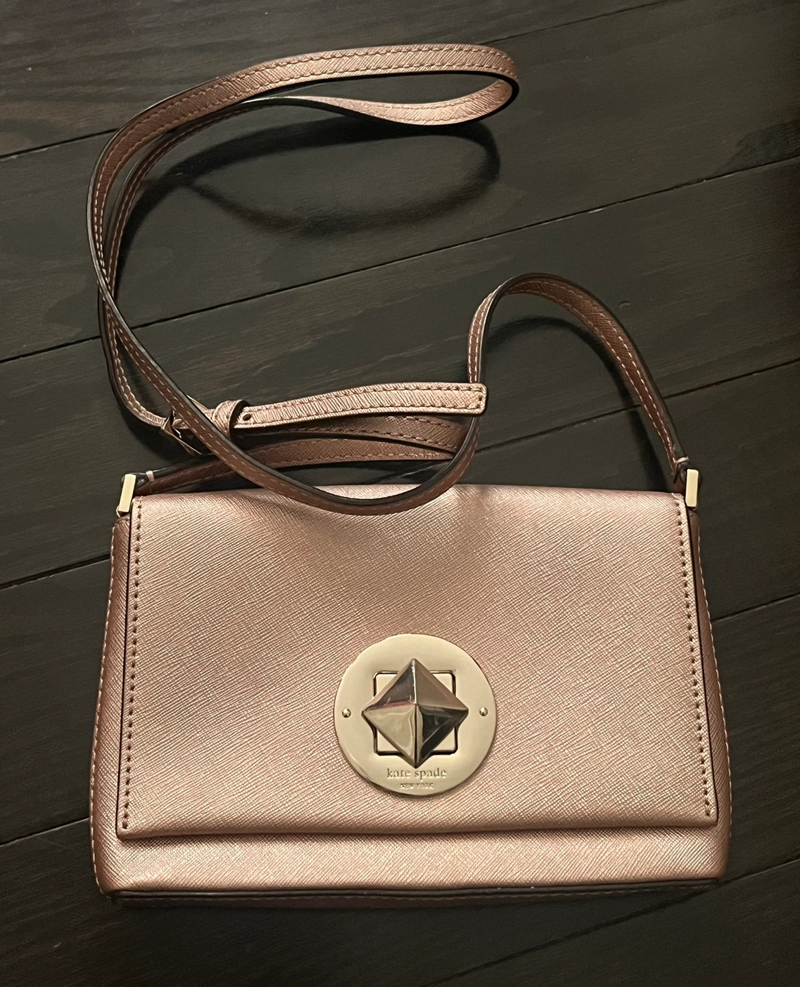 Excellent condition! Pickup Brampton or downtown Toronto Kate Spade New York Newbury Lane Sally Crossbody, color - Rose Gold. Beautiful saffiano leather with 14-karat light gold plated hardware, adjustable crossbody strap, turnlock closure, interior features slip pocket. Perfect for weddings, parties or just a night out on the town. The color really sparkles and stands out. Closure: Turn lock Outer shell: Saffiano Leather Bag size is approximate 7.5"L x 5"H x 1"D Strap Drop is 21" (adjustable)