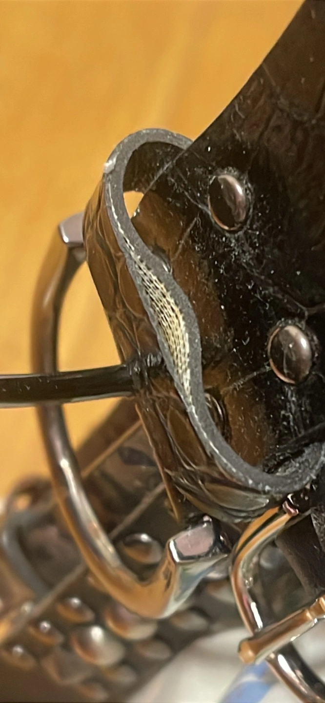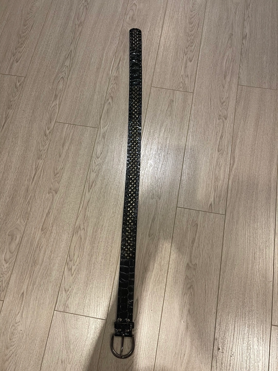 Black belt with silver studs. Crocodile embossed. Metal buckle. Very good quality, too small for me so I’m selling. The studs are not cheap like the Amazon stud belts and this helps bring any ordinary outfit to another level. There is a slight gap in the leather near the clasp which is shower in the picture