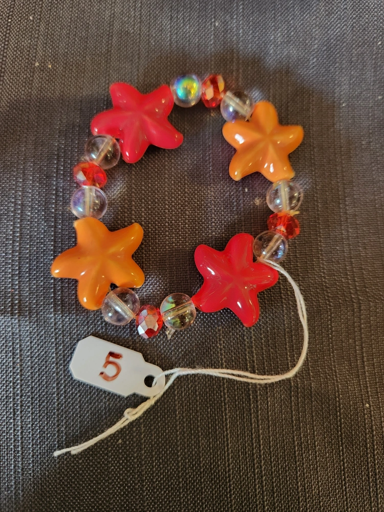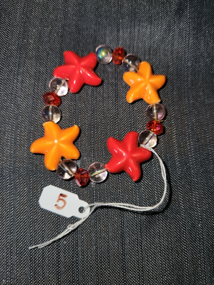 366Brand new, never worn! Bracelet stretches but it would fit most comfortably on a small wrist. Comes inside a classy black sash making it a lovely gift for someone or even a stocking stuffer if you're thinking ahead! $5 Pickup only. Cash only. Beaded bracelet with orange and red starfish charms. Clear and red beads.