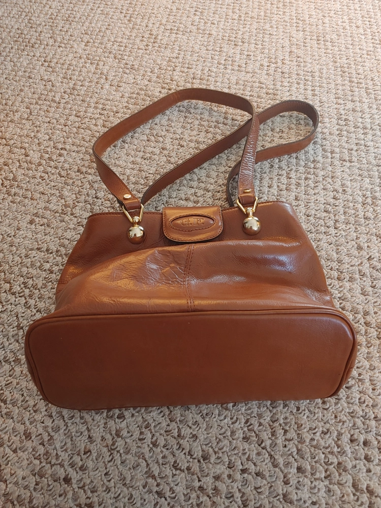 GF Brown leather shoulder bag with gold hardware. Has a long shoulder strap. Excellent condition.