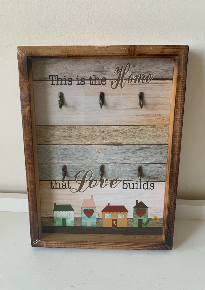 364Wooden key holder with five hooks and a farmhouse design. Features the saying "This is the home that love builds". New, in original film wrapping. Perfect for gift or home decor. From smoke and pet free home. Cash only. Not replying to AI suggested messages ex., Hi, I am interested, is it available etc. Serious inquiries only.