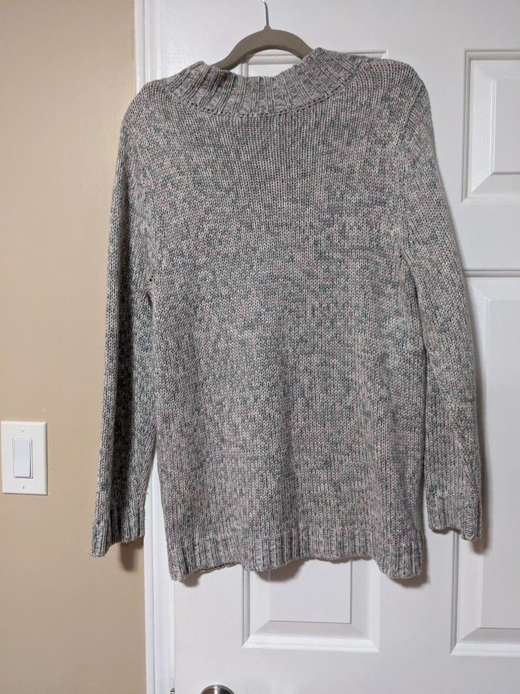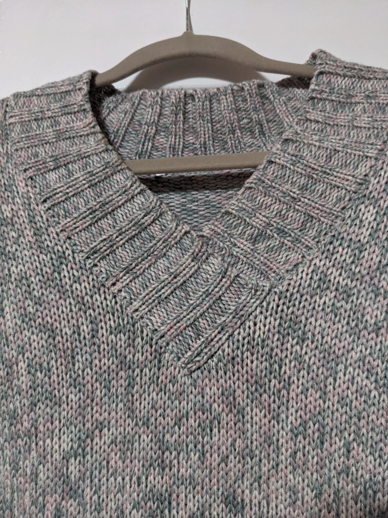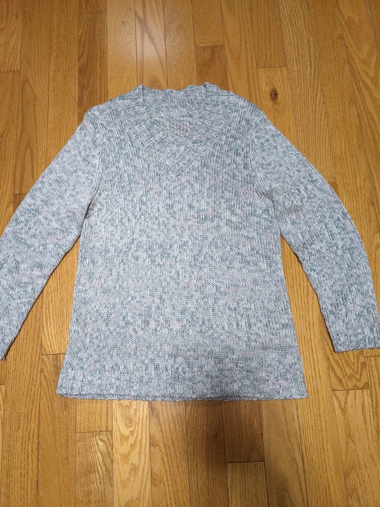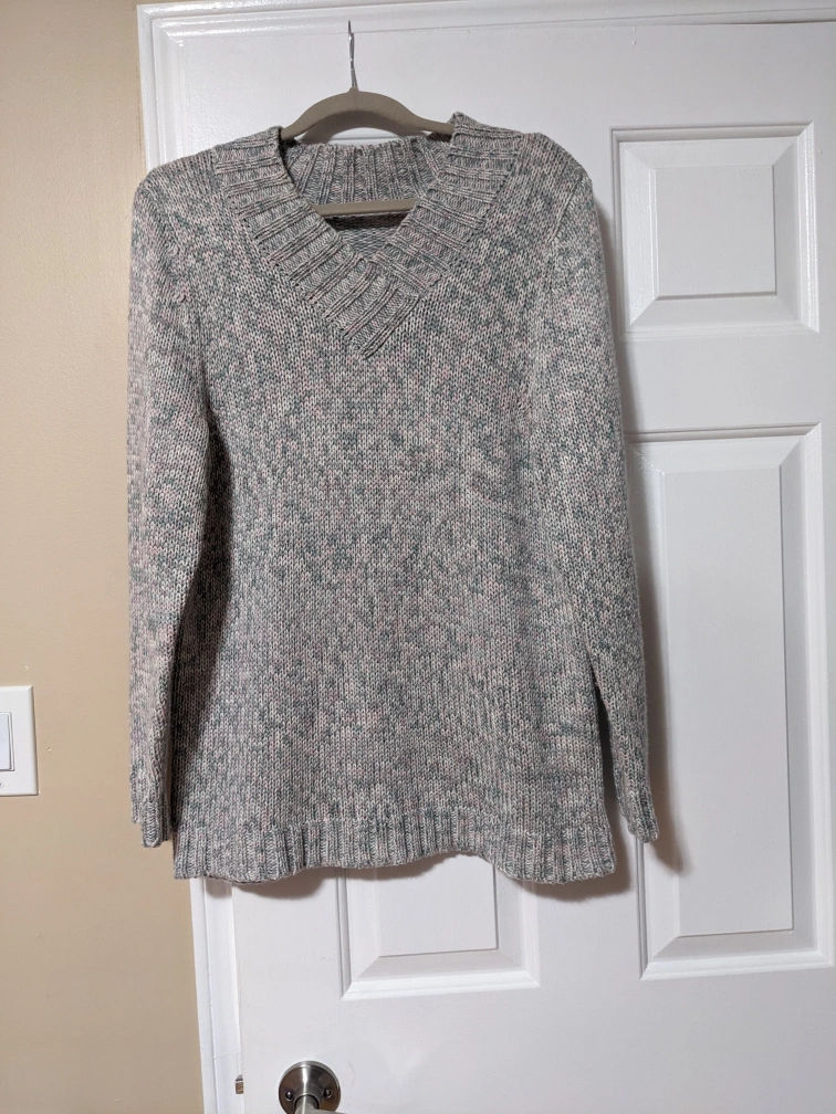 1000+Long-sleeved, grey, pink and beige sweater with a v-neck. Soft and comfy for the cool weather.