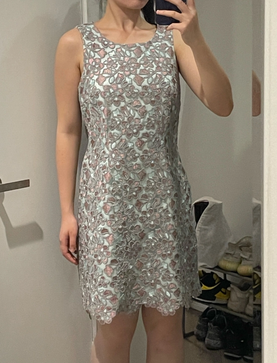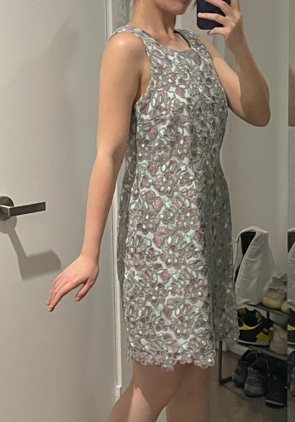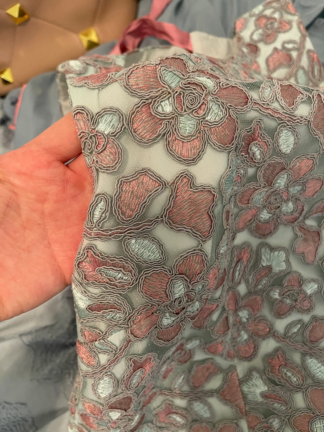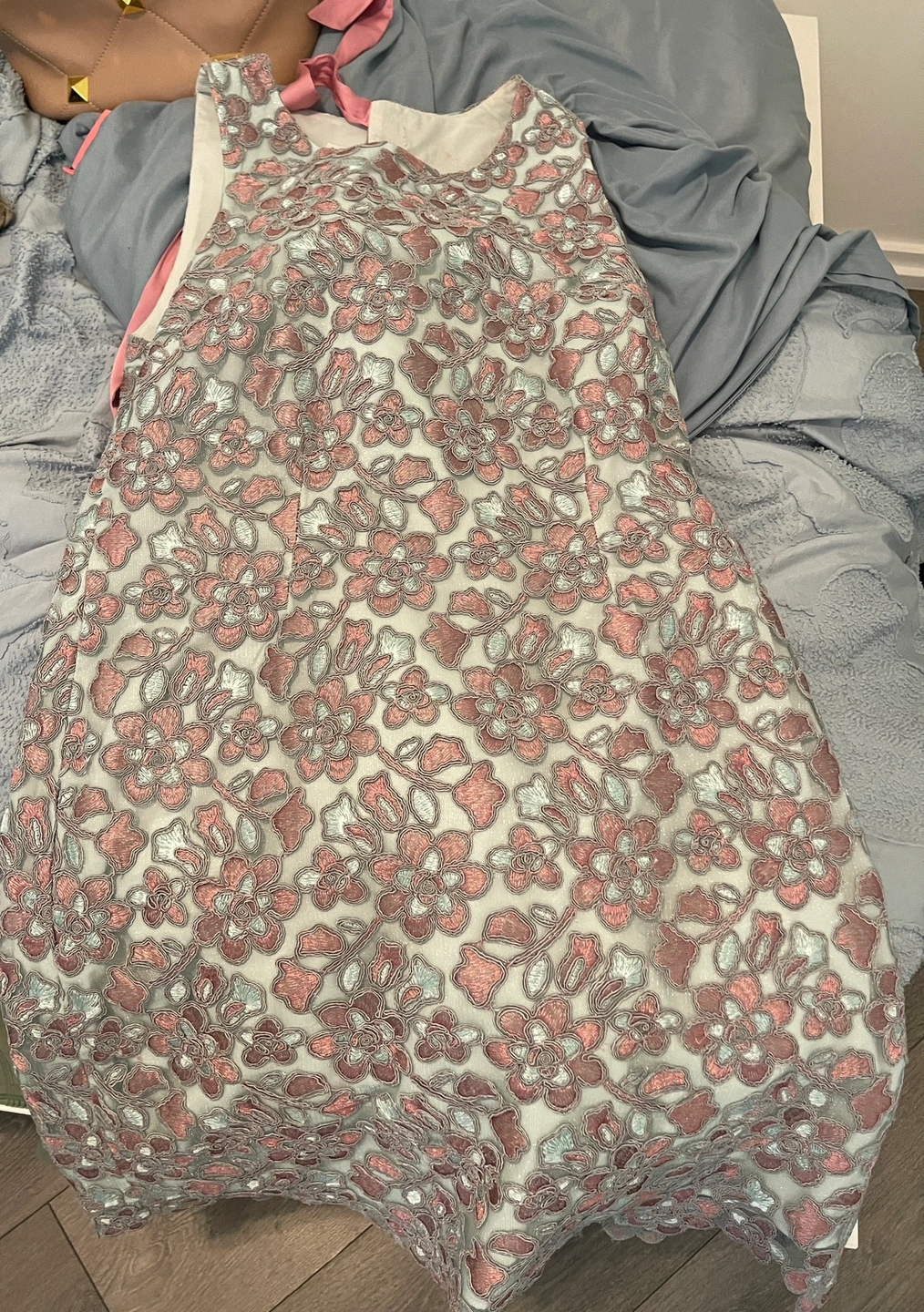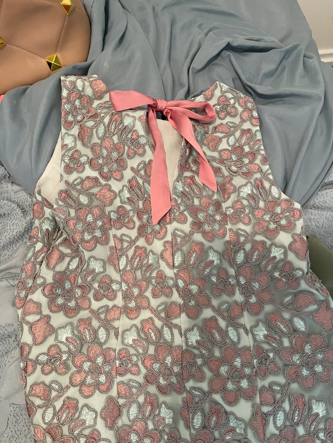 Sleeveless dress with pink and grey floral embroidery. Back bow. Size Medium.