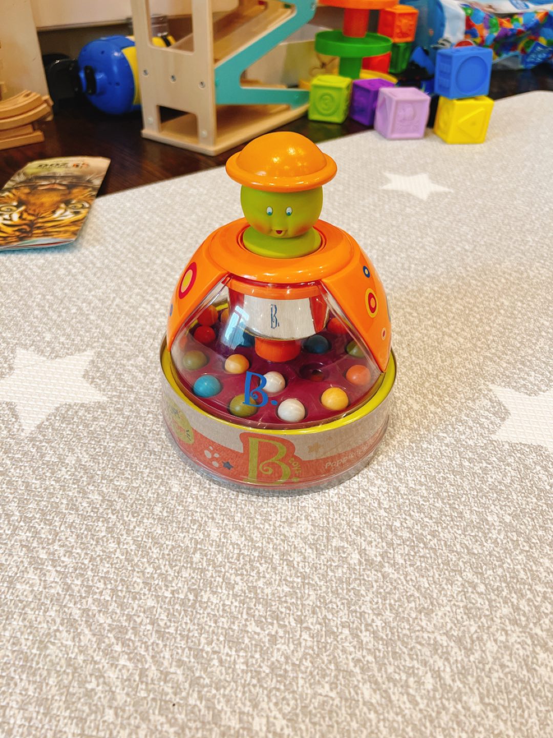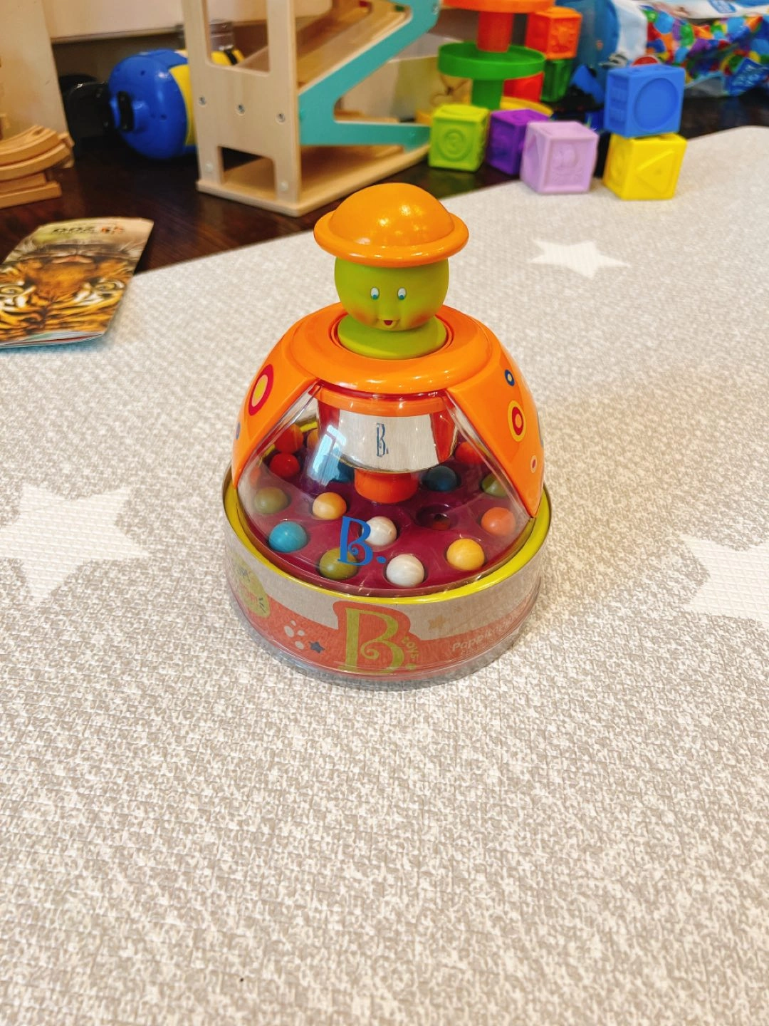 Brand new still in box! When you press the top, the spinner spins inside which makes all the little balls pop up and down, sounds and visual stimulation! Originally 30$. Moving sale, didn’t have time to open yet.