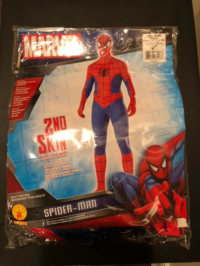 Adult Spider-Man costume. Full-body stretch jumpsuit. Size large. Fits heights between 5'4" - 5'10".