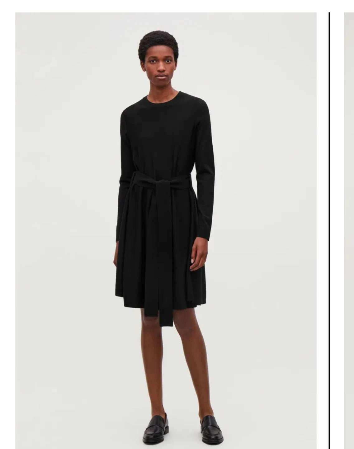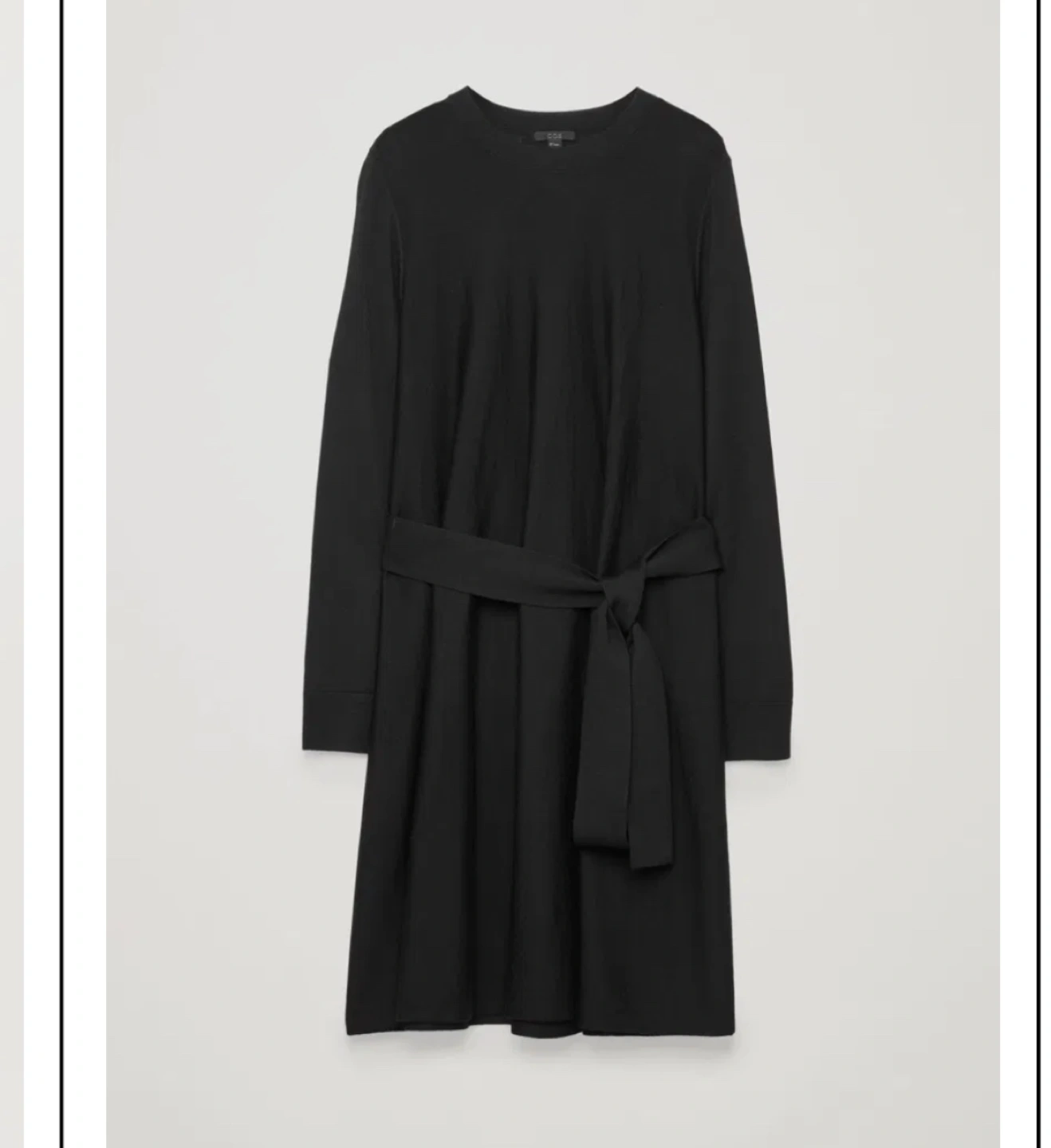 Black knit dress with a belt. Long sleeves and a round neckline.