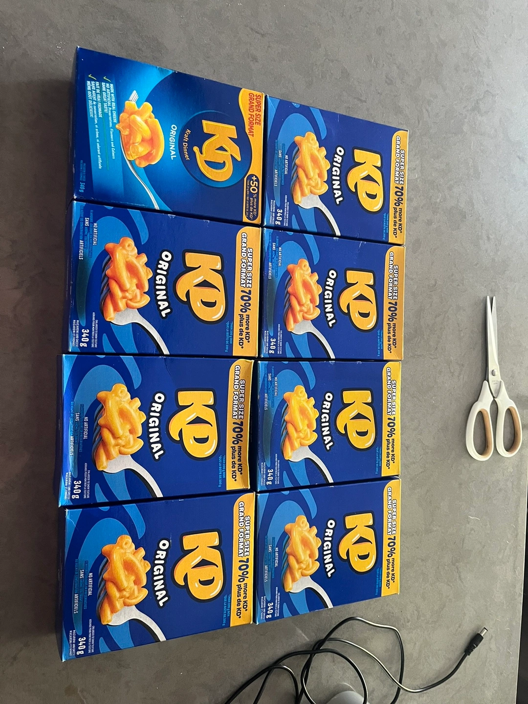 Seven boxes of KD Original Kraft Dinner, super size. 70% more KD than the regular size.