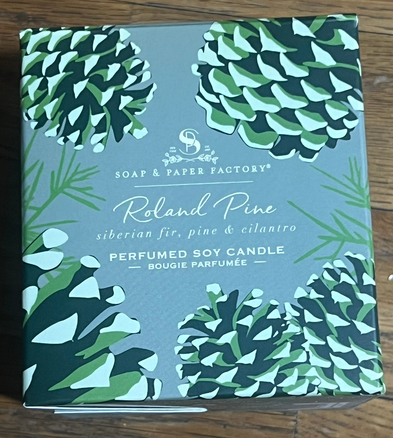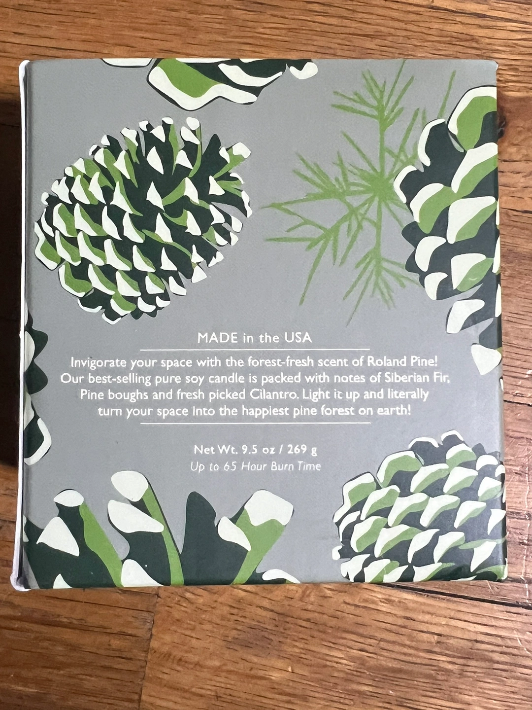 Soy candle with a pine scent. 9.5 oz. Roland Pine Siberian Fir, Pine & Cilantro. New in box, never used.