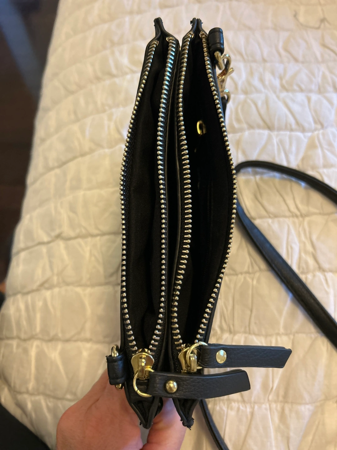 Black crossbody bag with gold accents. Has two main zippered compartments. Strap Is not adjustable. Great little black purse. Lots of compartments.