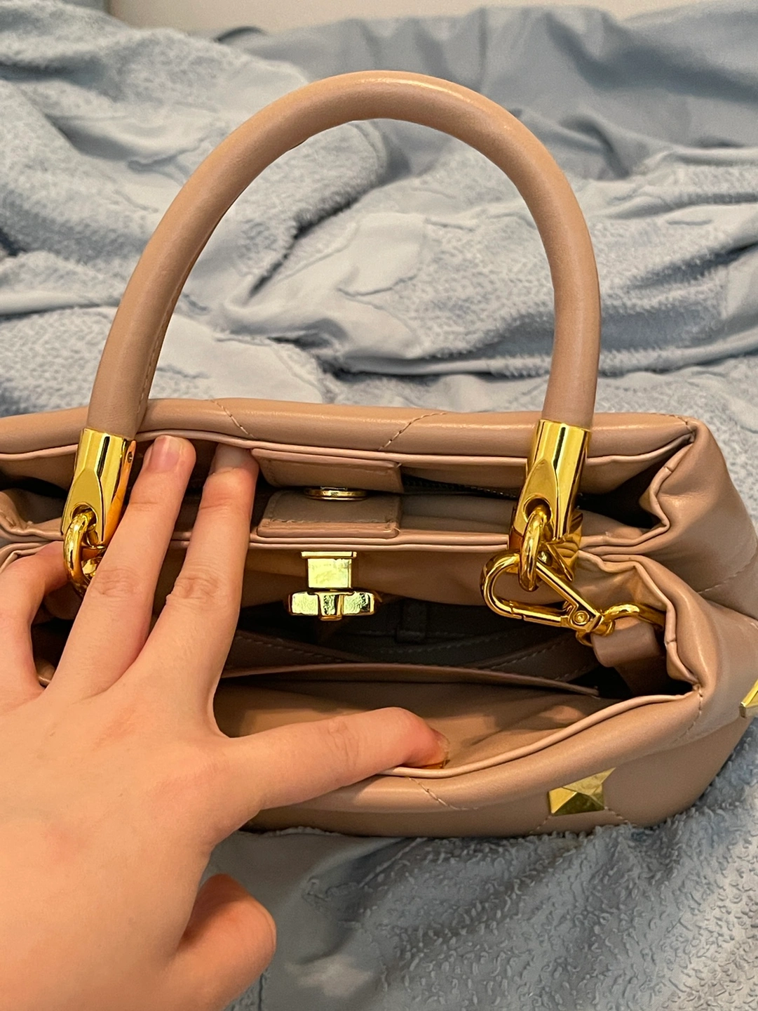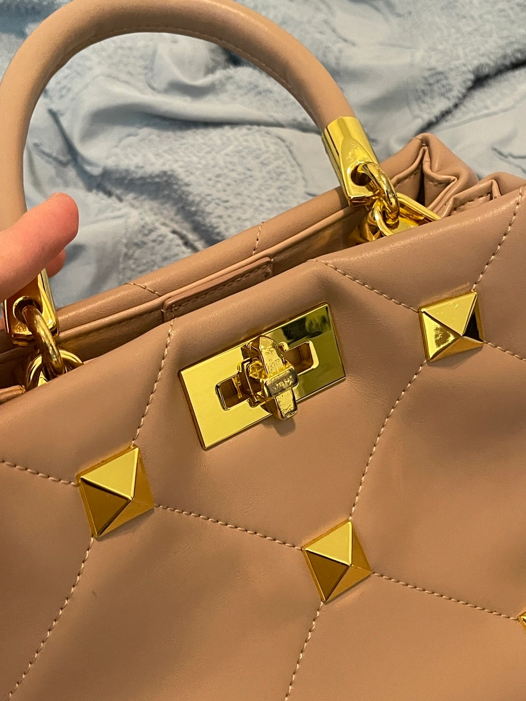 Small, quilted handbag with gold accents and hardware. Has a top handle and a detachable shoulder strap. Features Valentino newly launched edition.