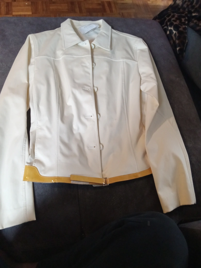White leather jacket with yellow accents. Button closure. Long sleeves.