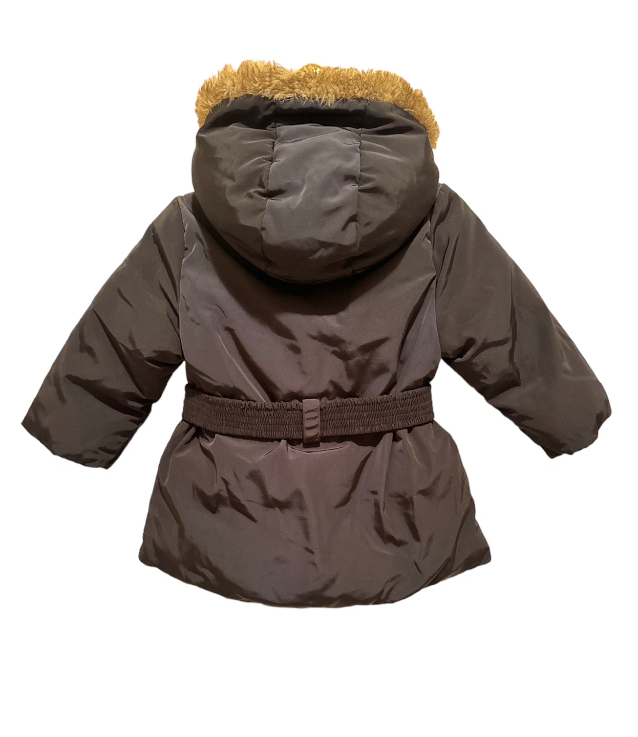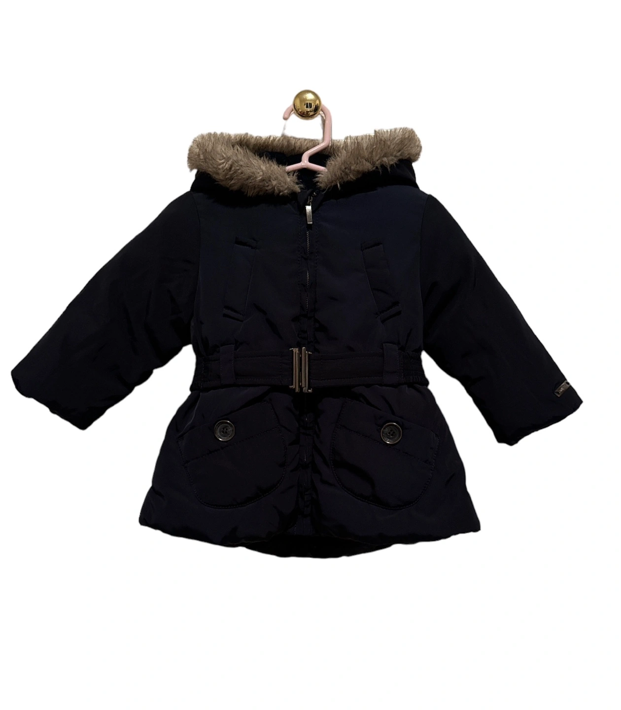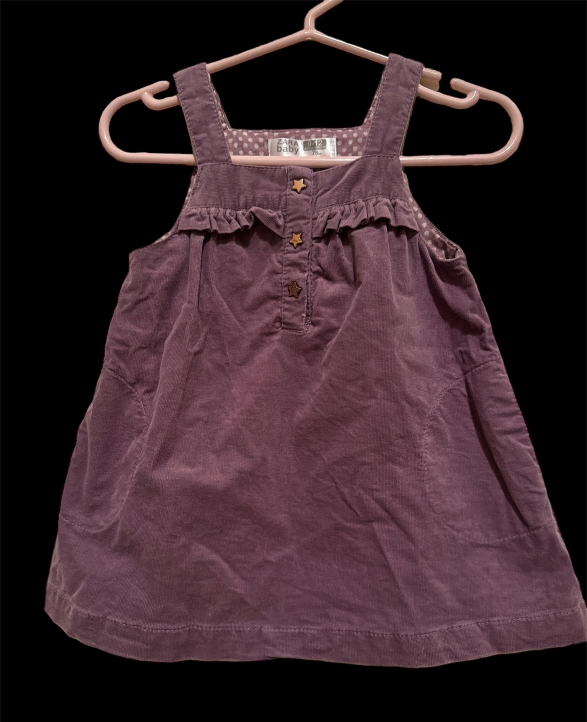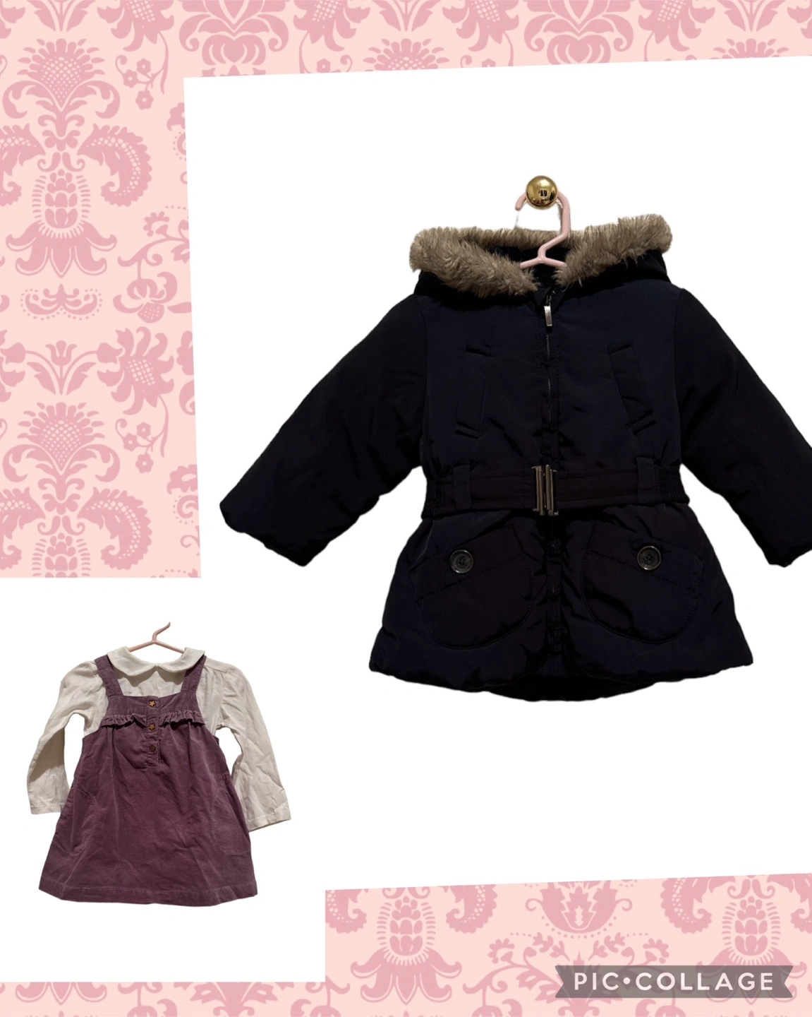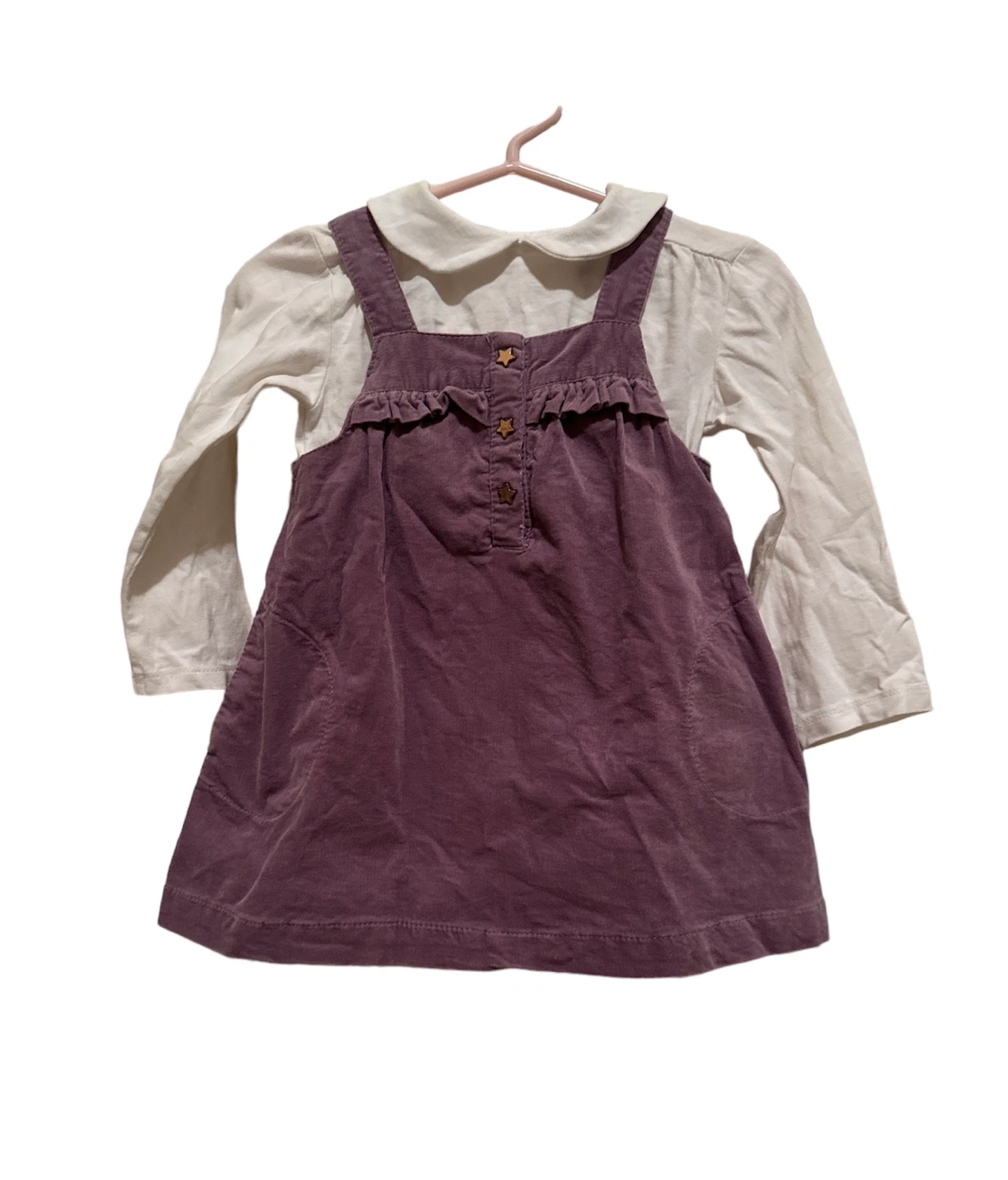 Two piece outfit includes a purple corduroy dress and a navy blue winter coat. The dress has a white long-sleeve shirt attached with a Peter Pan collar. 9-12 months.