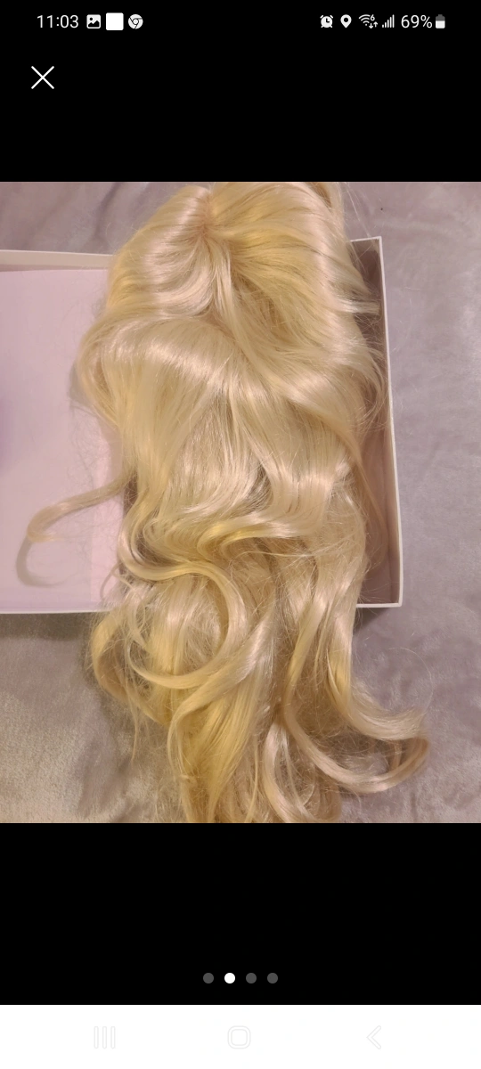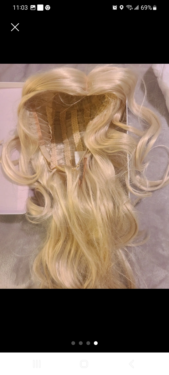 Blonde wig, adjustable, silky-soft imported fibre, shampoo washable. excellent condition. regular price $40.