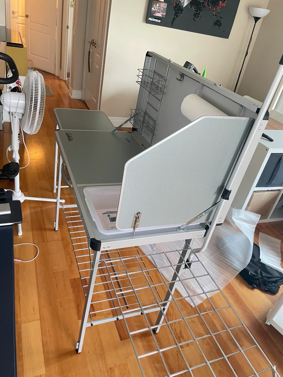 Foldable kitchen with a countertop, a side shelf, and a storage bag. Includes a sink, cutting board, and utensil holder.