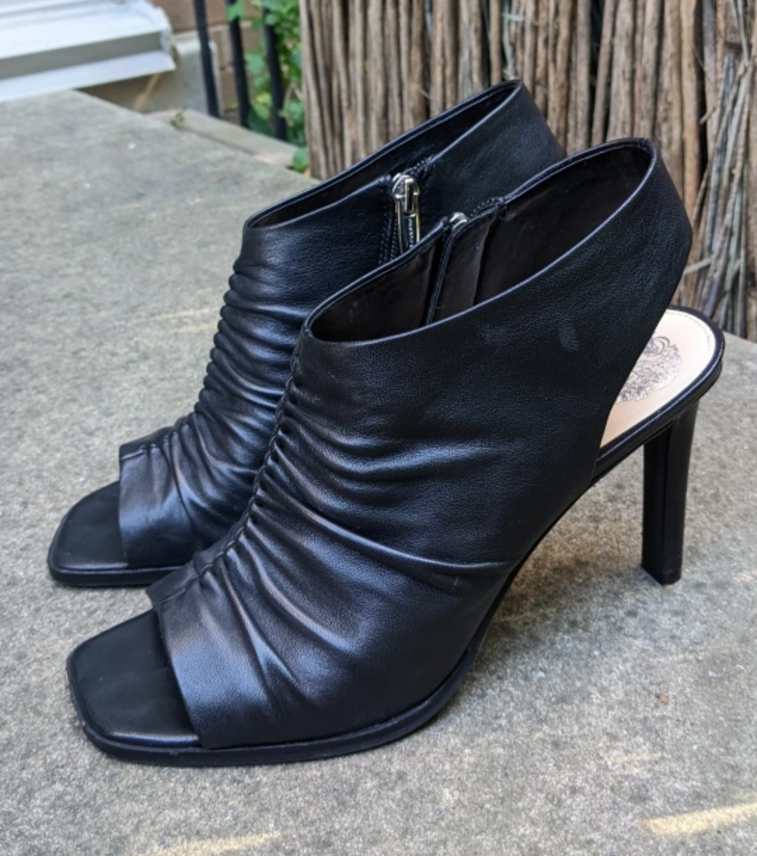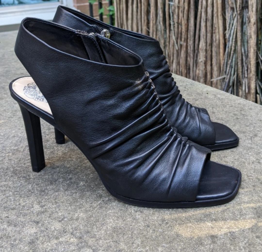 Worn once. Genuine Vince Camuto black leather peep toe heels with a size zipper. Ruched detailing on the covered potion.