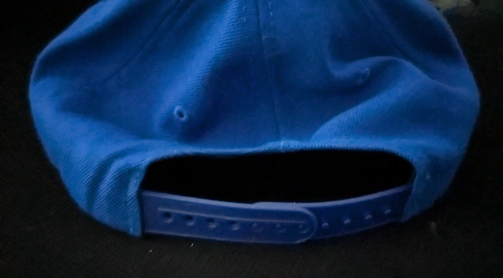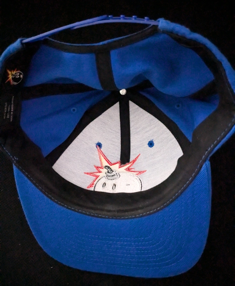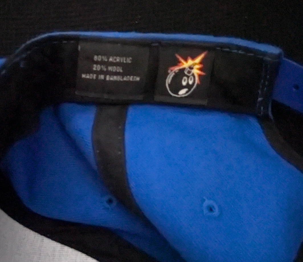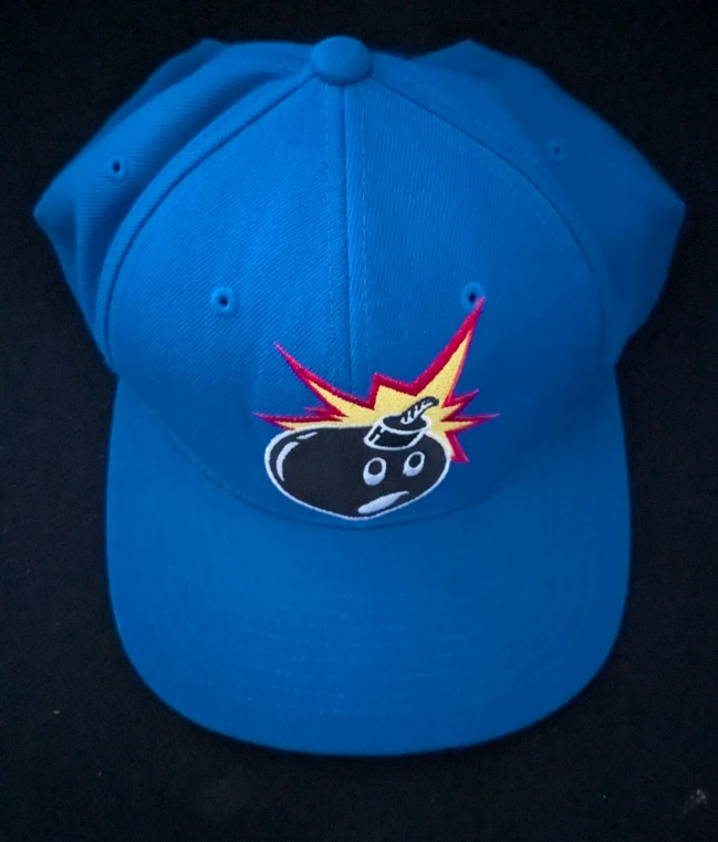 Blue Bomb Snapback hat. Adjustable size. 80% acrylic, 20% wool.