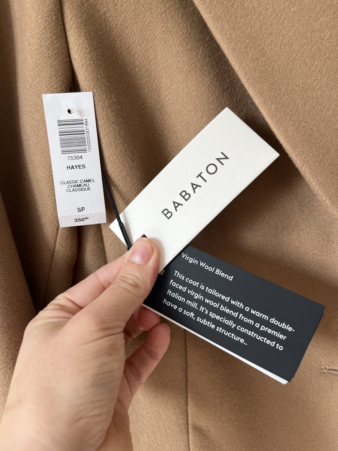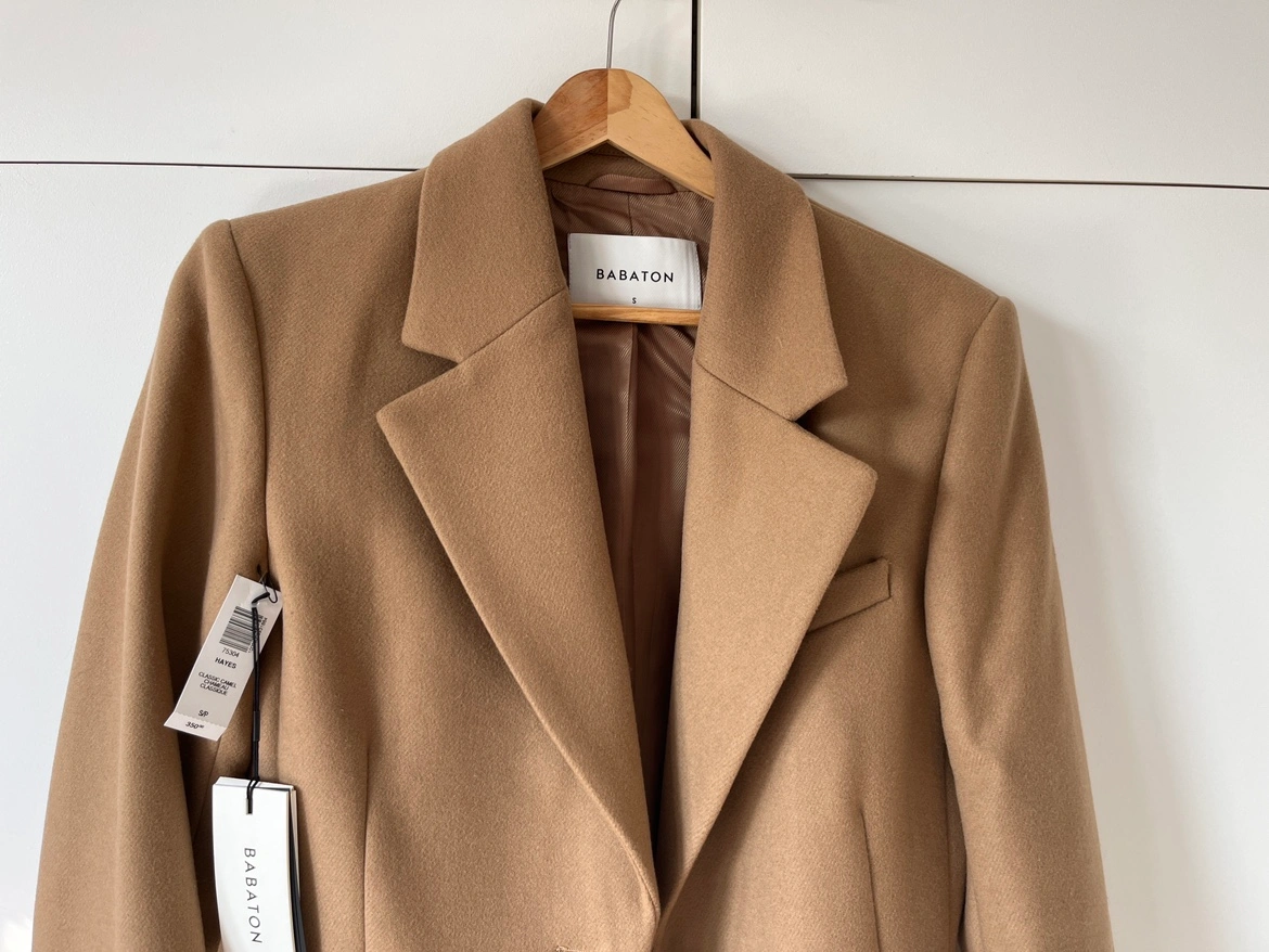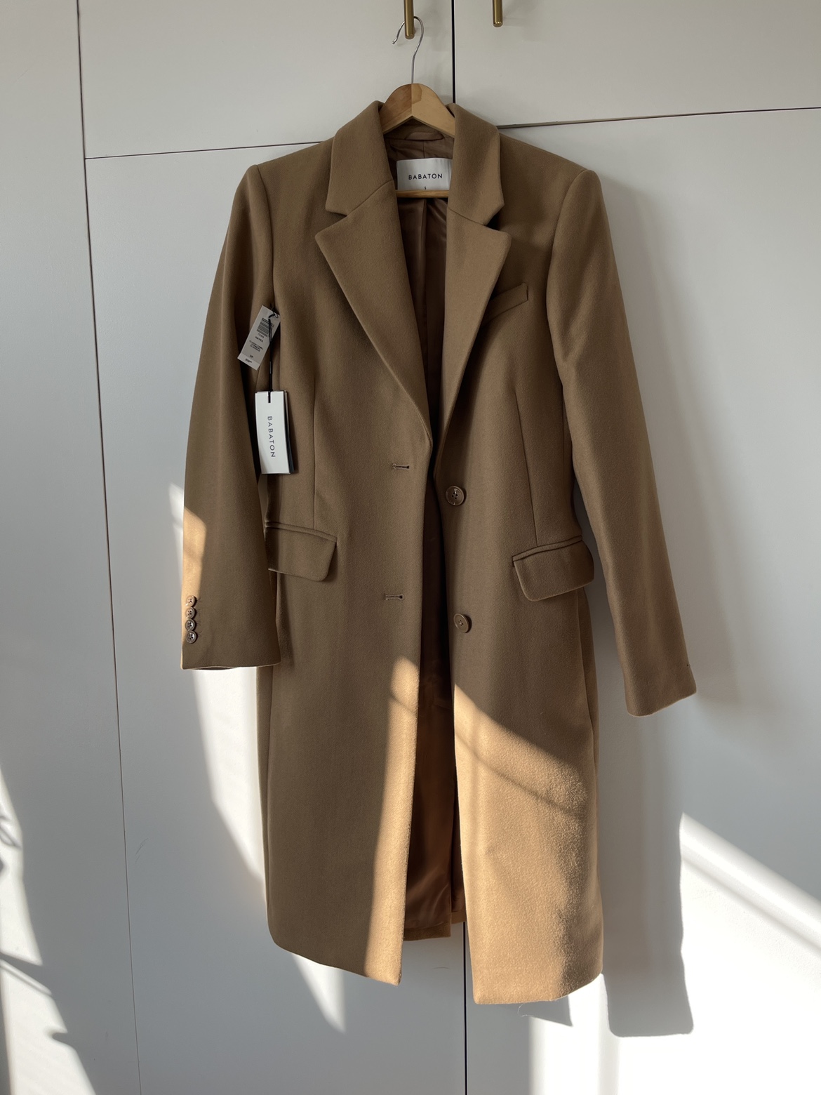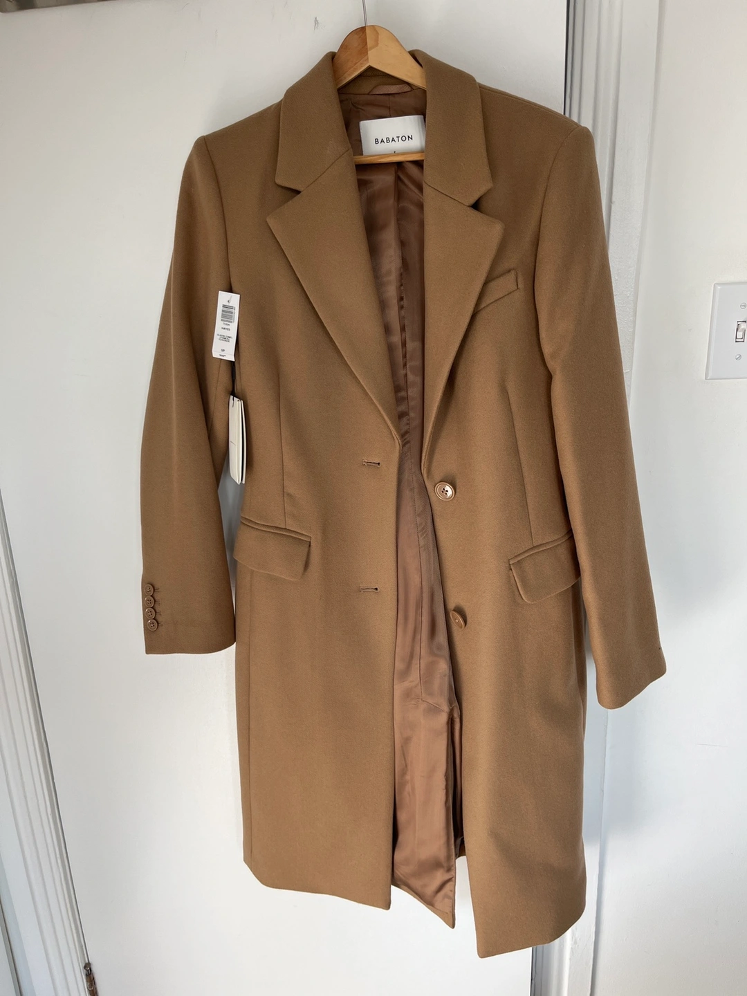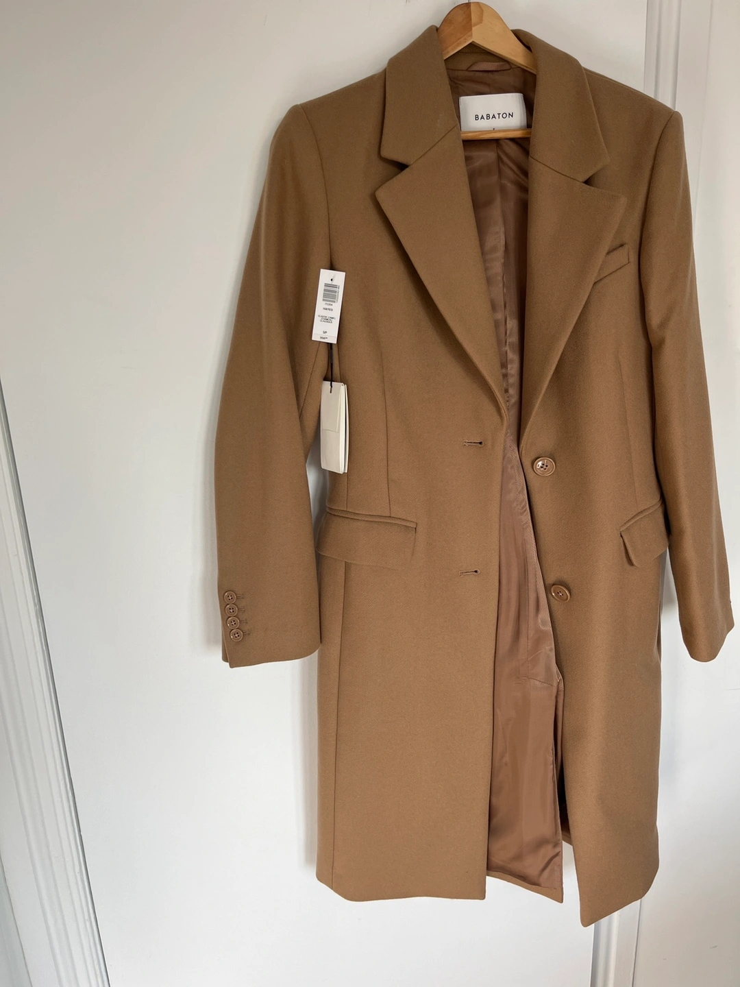 Brand new, never worn aritiza babaton camel coat, classic style, single breasted. Has two front pockets and button closure.