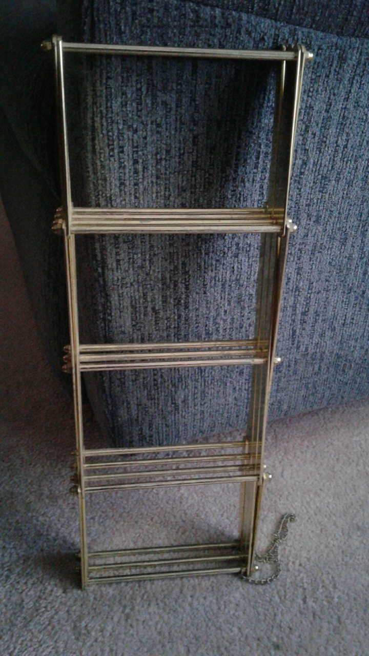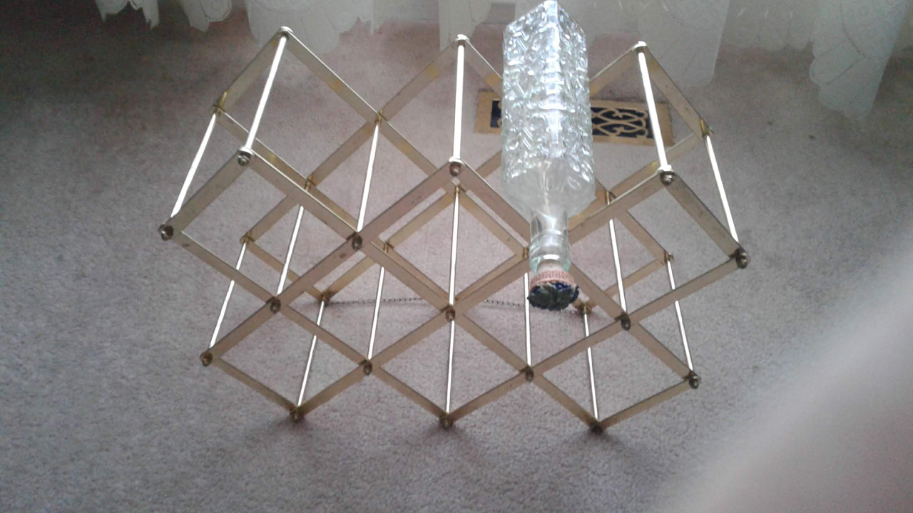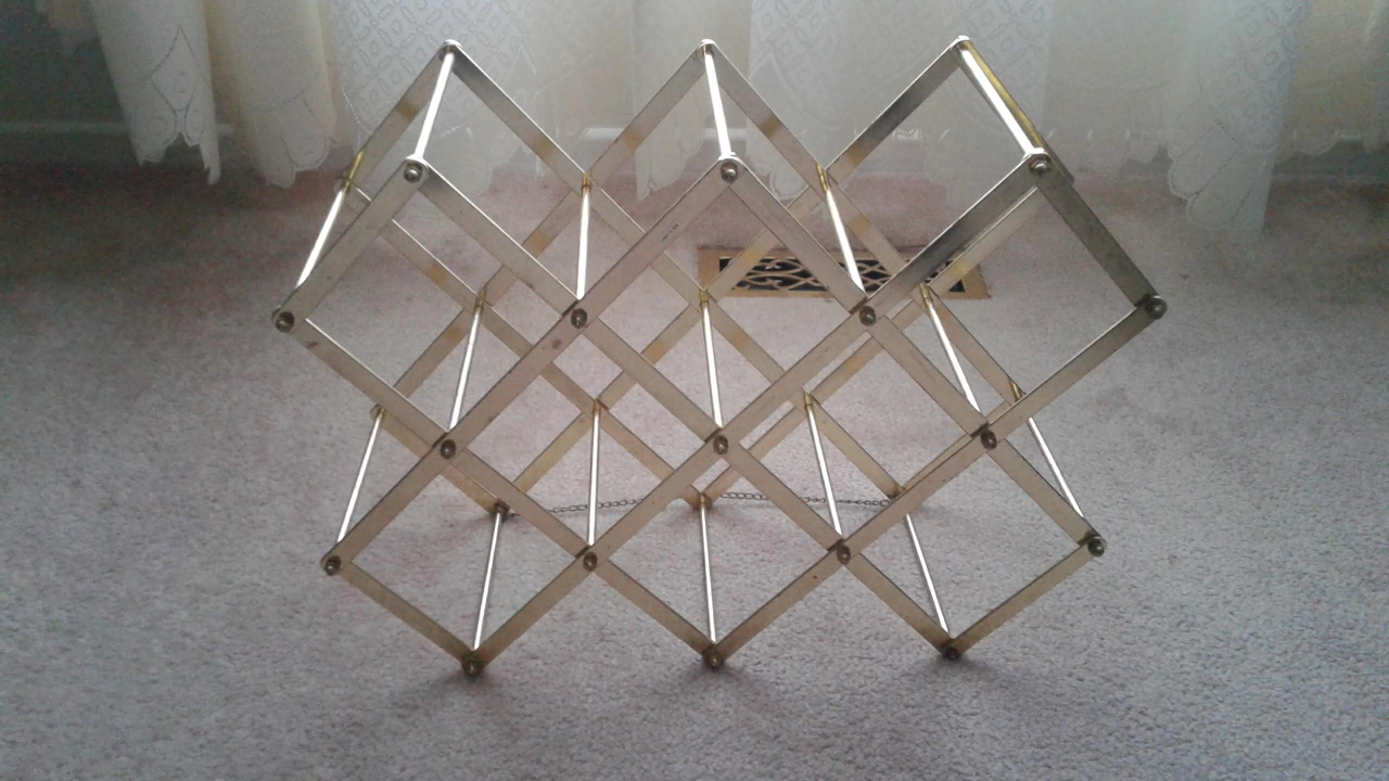 Collapsible wine rack made of gold-toned metal. Holds bottles and displays in style. Folds flat for storage.