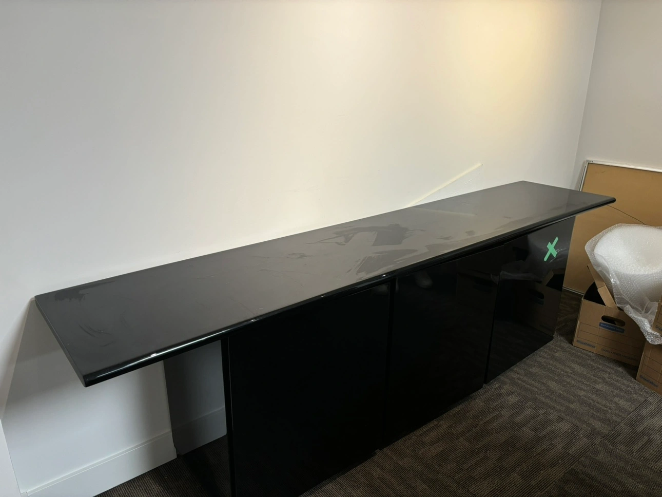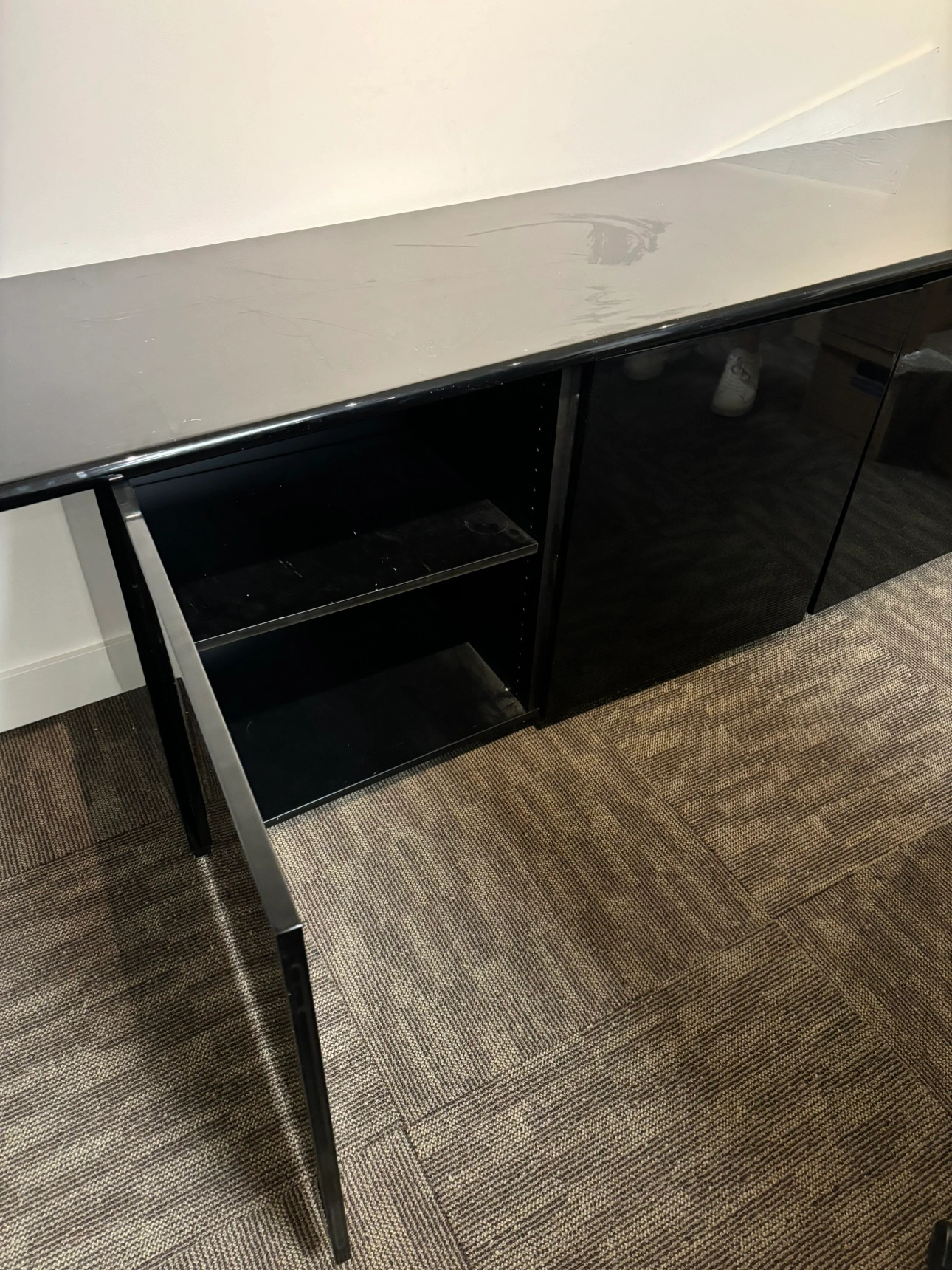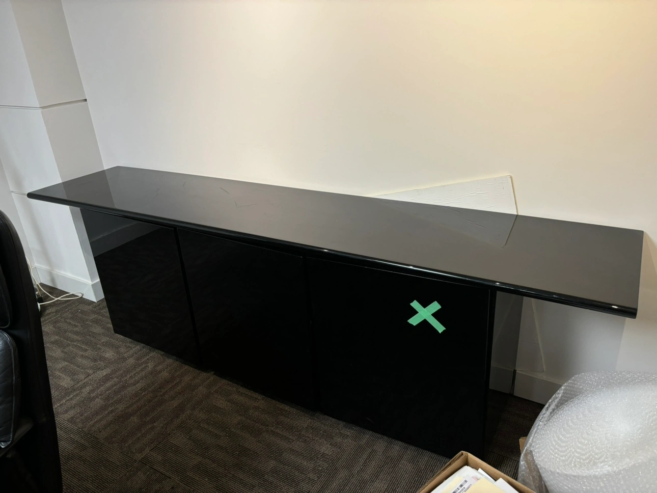 309Large black cabinet with three doors and a shelf. Black gloss 3 door credenza. Would be perfect in a dining room/ office or as a tv stand. Dimensions: 96 wide 30 high 20 deep Some scratches on top. Sturdy piece